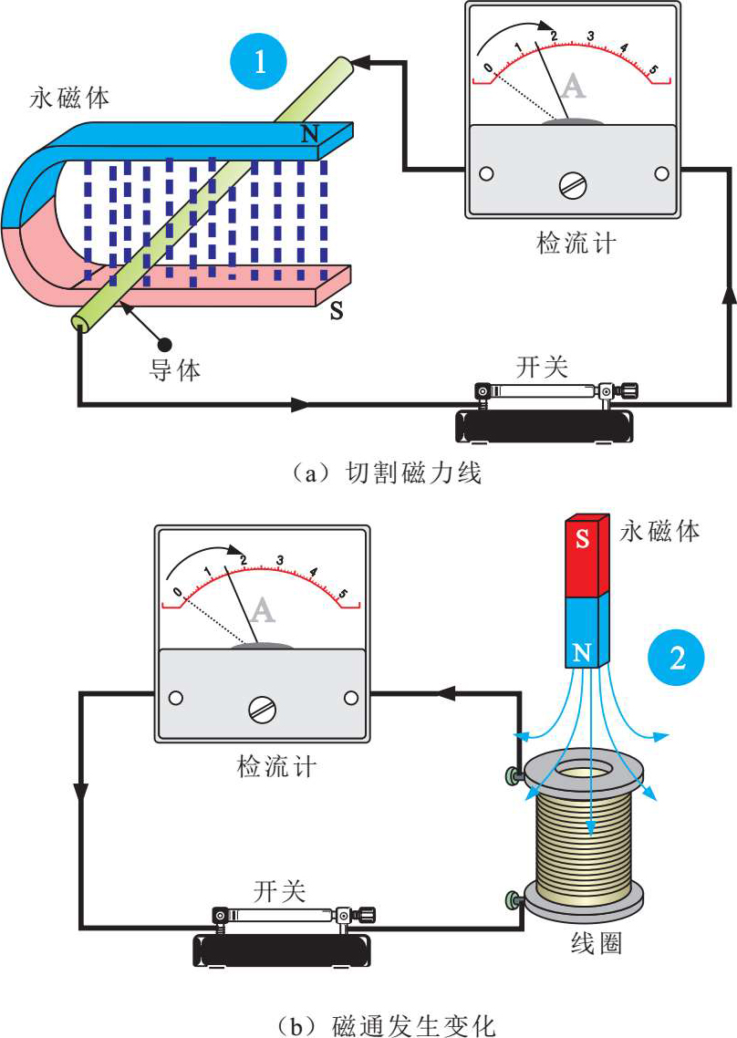 图1-10为电磁感应实验。当闭合回路中一部分导体在磁场中做切割磁力线运动时,回路中就有电流产生;当穿过闭合线圈的磁通发生变化时,线圈中有电流产生。这种由磁产生电的现象,称为电磁感应现象。