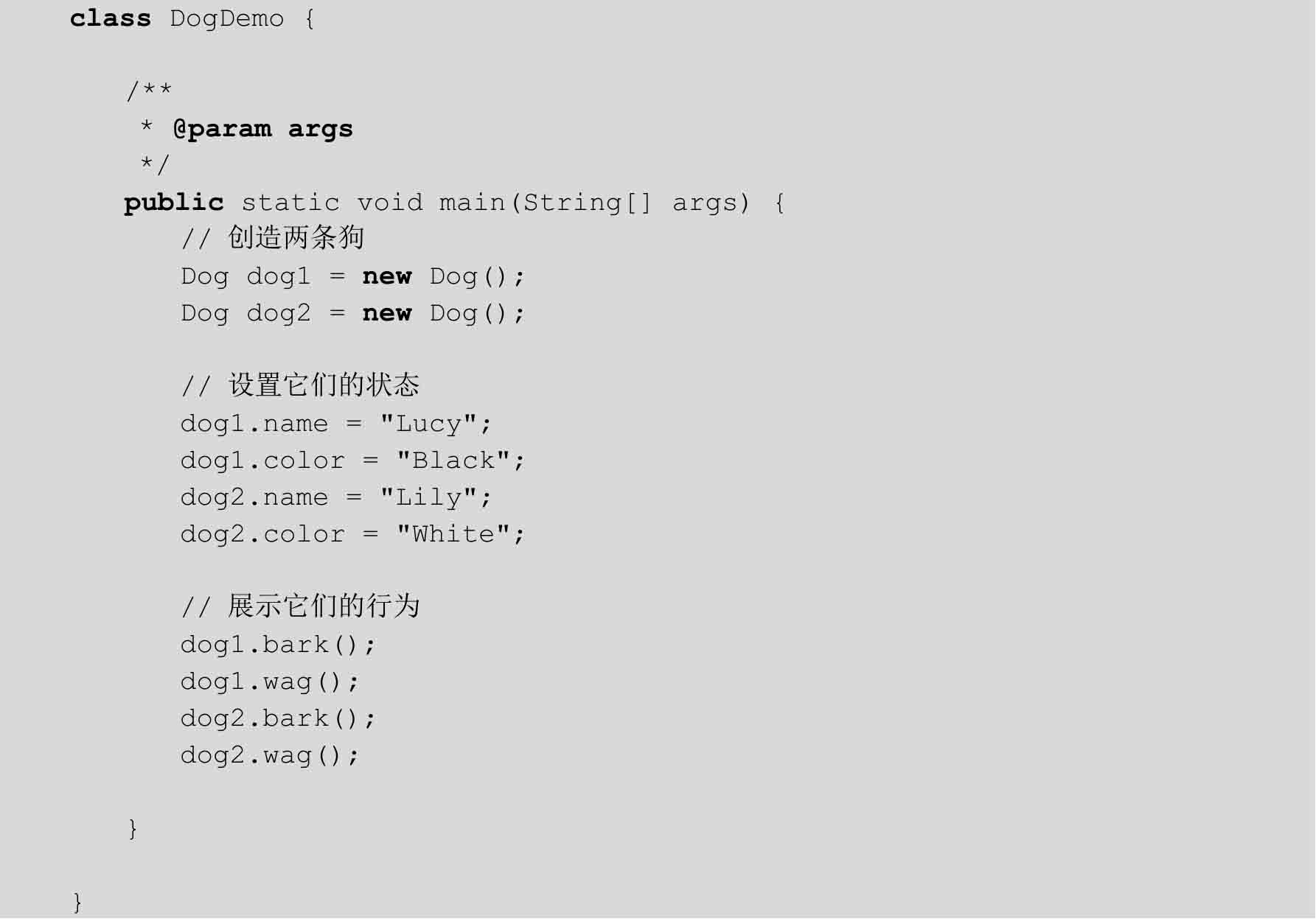 在这个例子中,类的名称是Dog,Dog对象的名称分别是dog1和dog2,可向Lucy对象发出的请求包括叫唤(bark)、摇尾(wag)。我们是通过使用new关键字来新建对象的。为了向对象发送一条消息,我们列出对象名(dog1、dog2),再用一个句点符号(.)把它同消息名称(bark、wag)连接起来。从中可以看出,使用一些预先定义好的类时,我们在程序里采用的代码是非常简单和直观的。