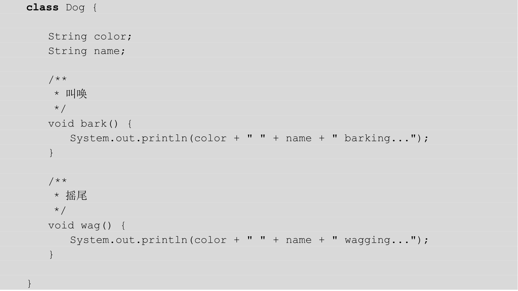 字段color和name是对象的状态,方法bark和wag定义了与外界的交互。