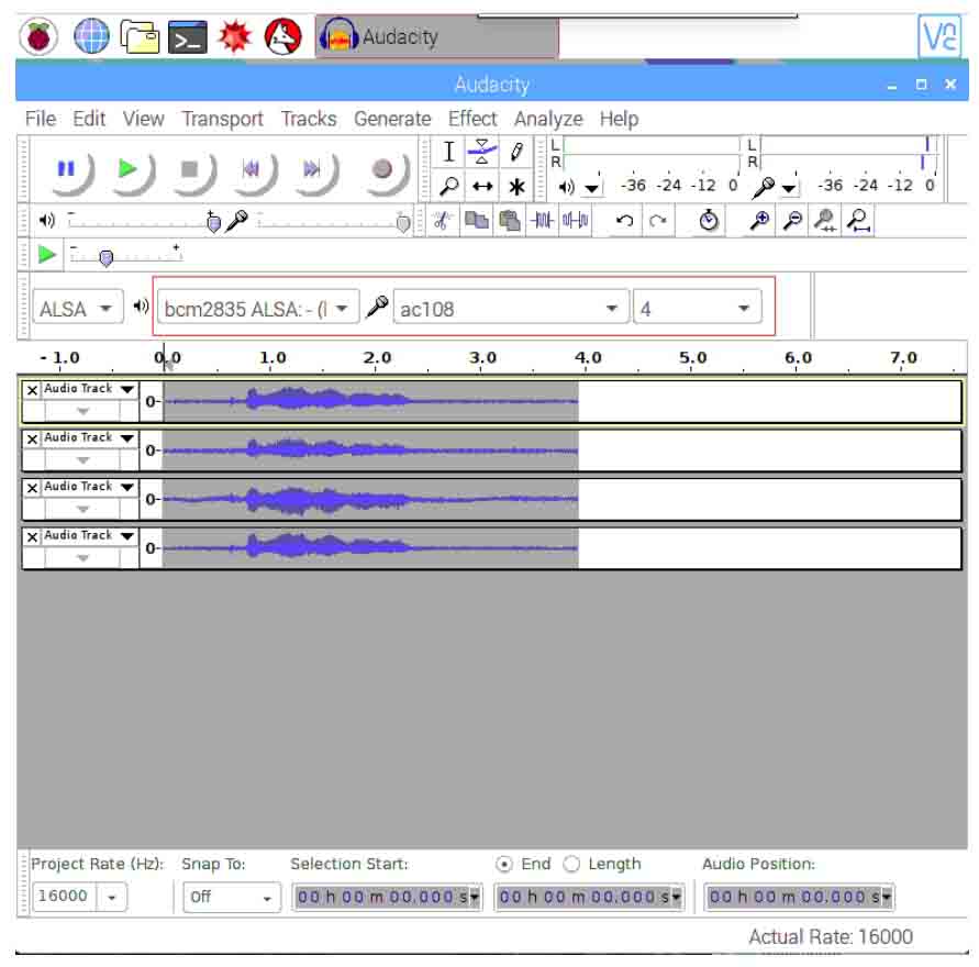 可以用arecord录制,然后用aplay播放(不要忘记插耳机或者喇叭):也可以通过Audacity软件测试。打开Audacity后,选择AC108和2通道作为输入、bcm2835 alsa: - (hw:0,0)作为输出来测试: