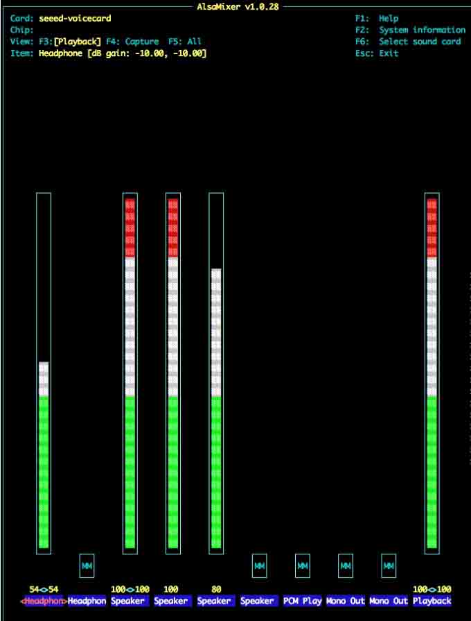 如果要更改alsa设置,可以使用sudo alsactl --file=ac108_asound.state store保存现有设置。当你需要再次使用这些设置时,可将它复制到sudo cp~/seeed-voicecard/ac108_asound.state/var/lib/alsa/asound.state。