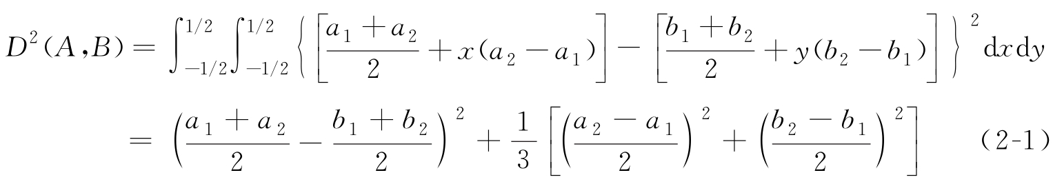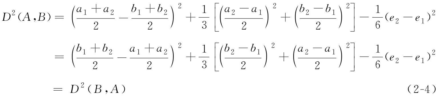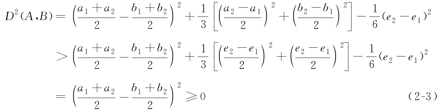 此外,由式(2-1)不难看出,当 a 1 = a 2 = a 且 b 1 = b 2 = b 时, D ( A , B )=| a - b |,此时为两点之间的距离。当 A 或 B 有一个为点值时, D ( A , B )为点与区间的距离。