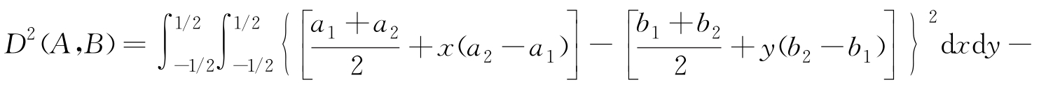 假设两区间分别为 A =[ a 1 , a 2 ], B =[ b 1 , b 2 ],其中, a 1 、 a 2 、 b 1 、 b 2 均为实数,则区间 A 和区间 B 之间的距离 D ( A , B )由下式得出: