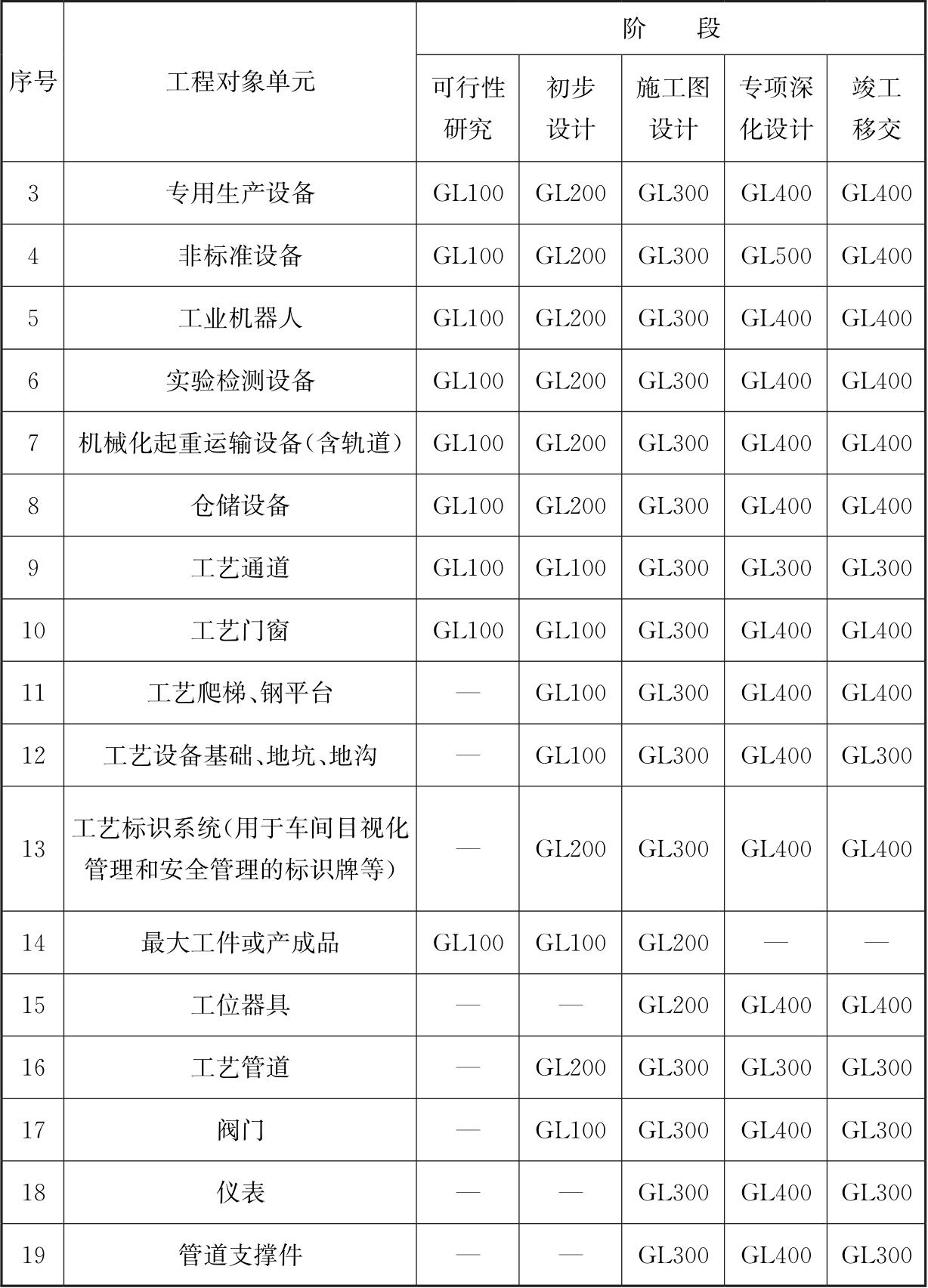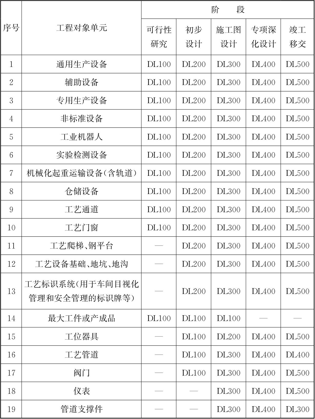 表5.2.1 工艺专业各阶段模型几何图形深度等级