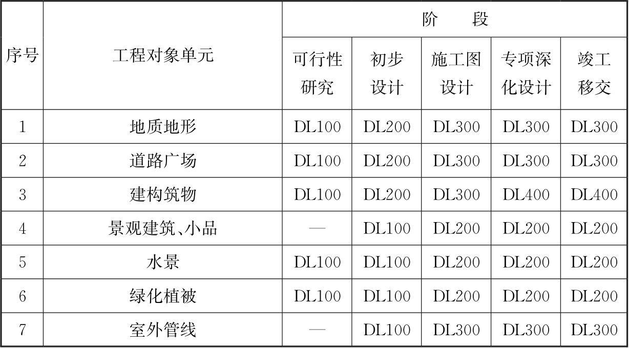 表5.3.1 总图专业各阶段模型几何图形深度等级
