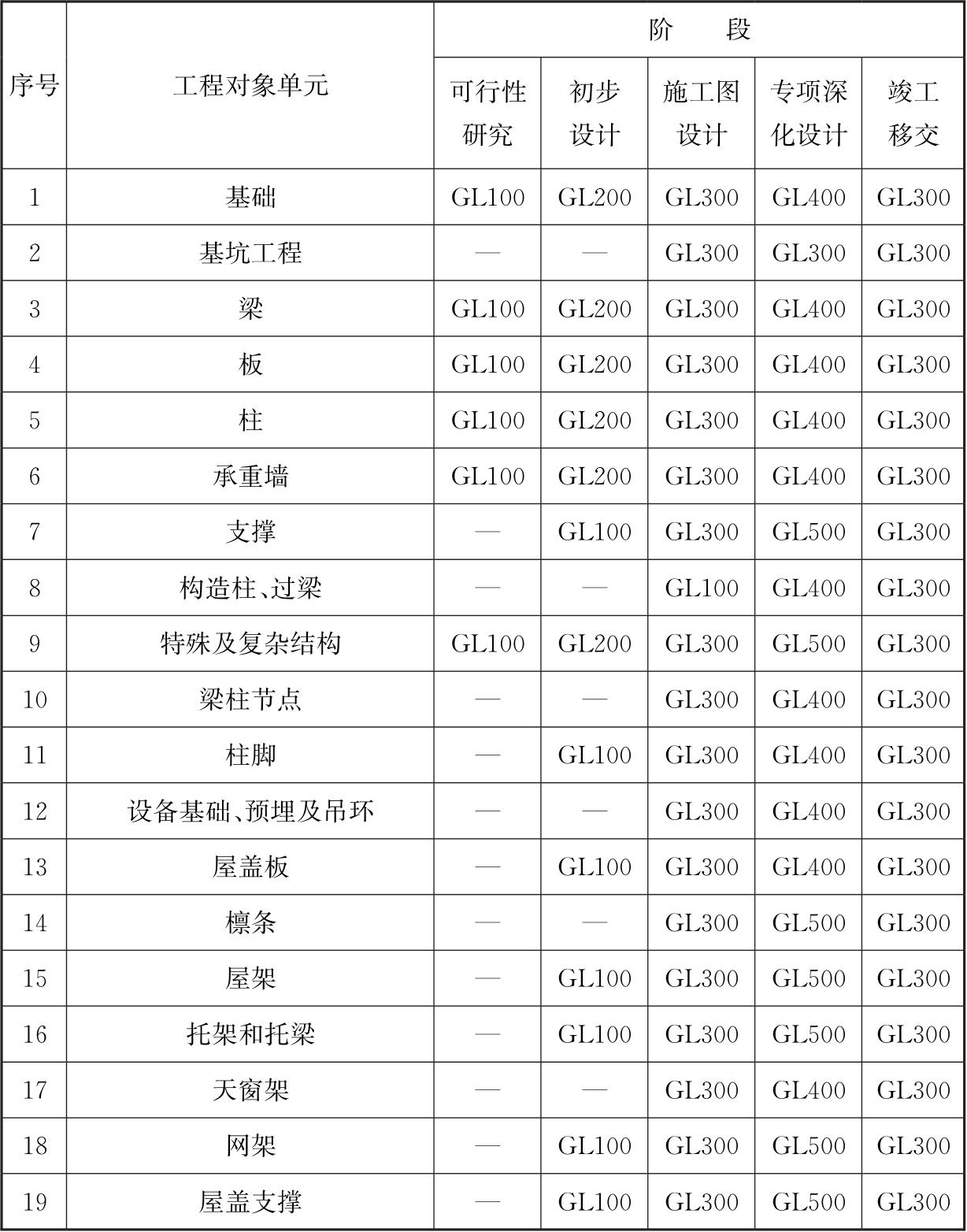 表5.5.1 结构专业各阶段模型几何图形深度等级