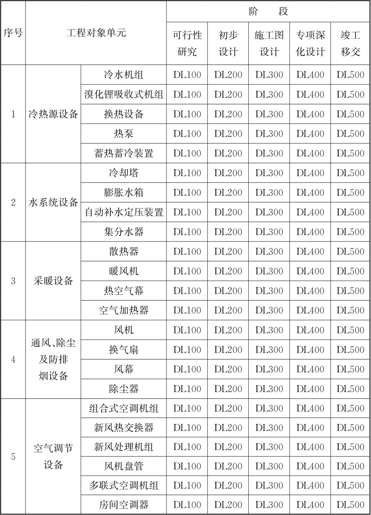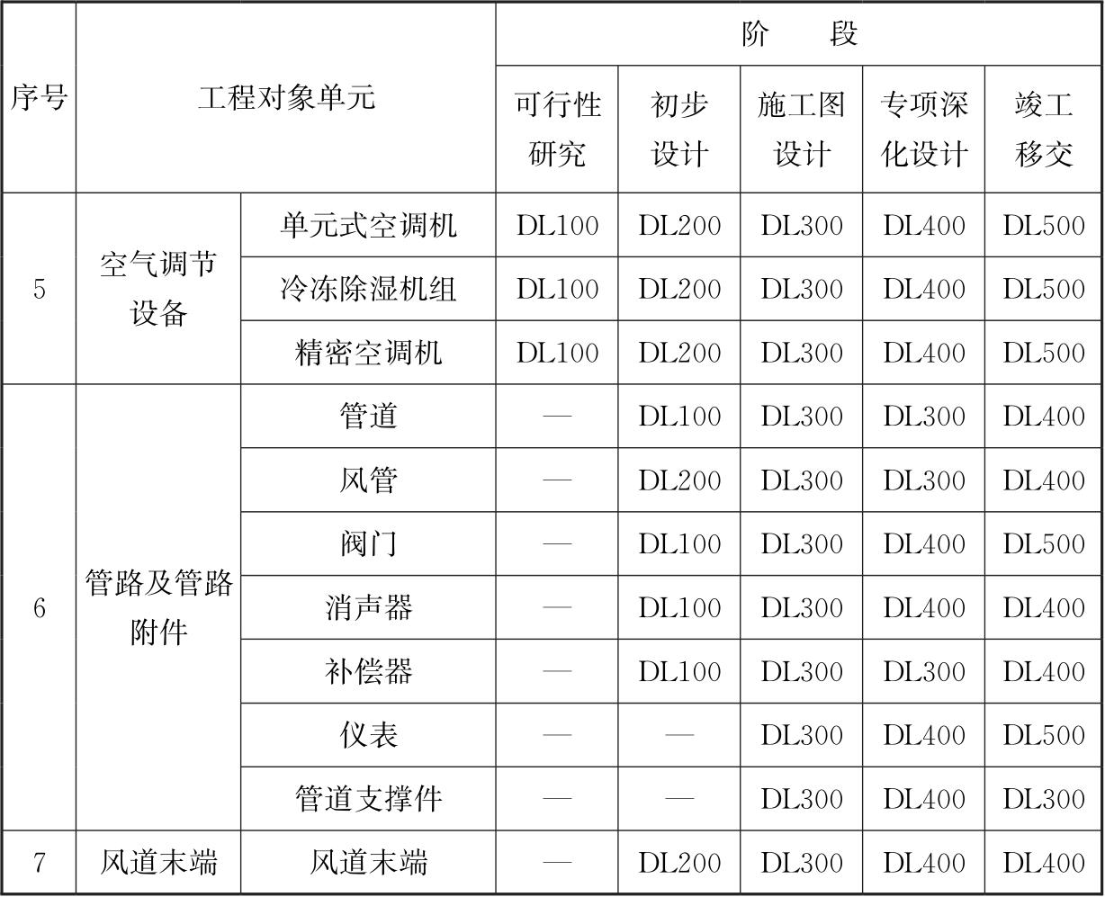 表5.7.2 暖通专业各阶段模型属性信息深度等级