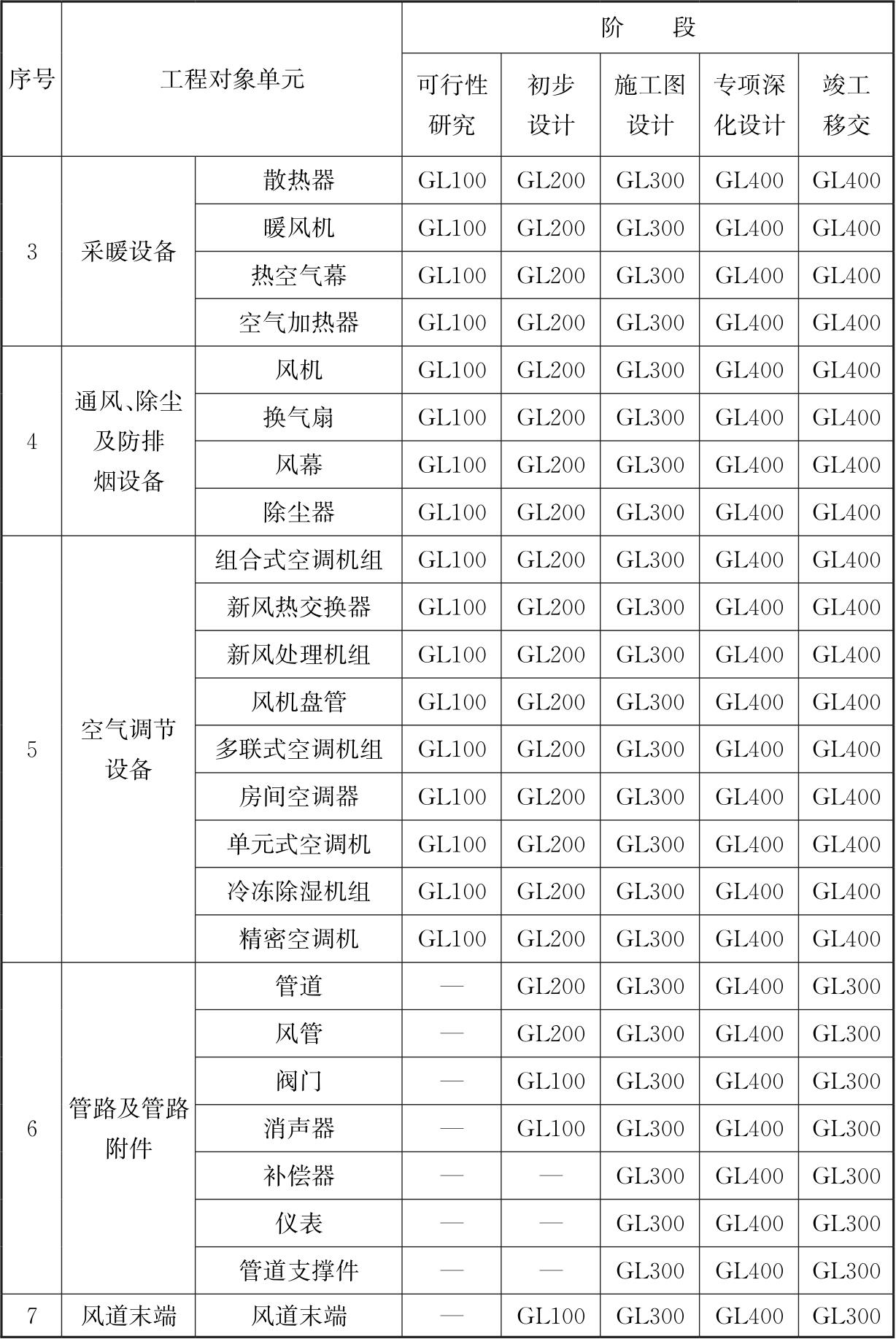 5.7.1 暖通专业各阶段模型几何图形深度等级,不应低于表5.7.1的规定。