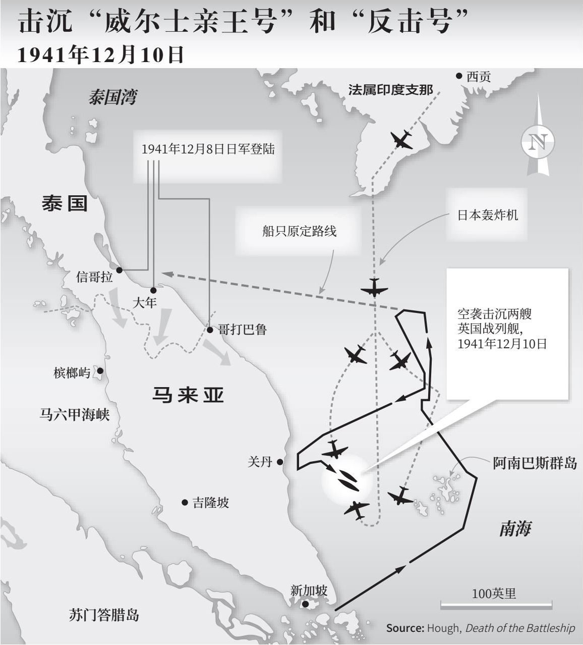 这意味着英国在太平洋残存的最后一道海洋防线也被突破了;这意味着印度现在也会面临来自海上的威胁,后来也确实马上遇到了威胁;这还意味着印度洋上的航线不堪一击。这两艘军舰对于英国海军的声誉意义重大,尤其是“威尔士亲王号”。“威尔士亲王号”是英国舰队中最新的战列舰之一,也是最有威慑力的。当年8月,丘吉尔乘坐该军舰来到纽芬兰的普拉森舍湾与罗斯福会面——那是丘吉尔和罗斯福上台后双方第一次会面。“威尔士亲王号”上宽阔的柚木甲板为英美高层初次会晤提供了绝佳的场所。