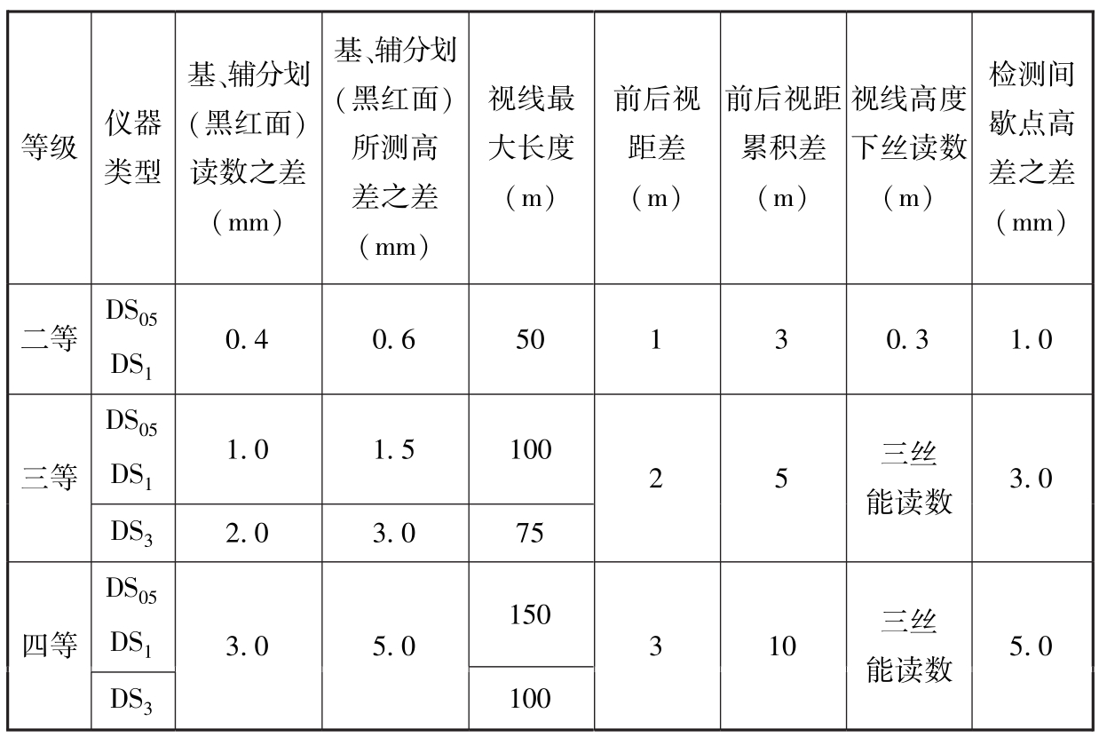 注:使用数字水准仪观测、双摆位自动安平水准仪时,不计算基、辅分划读数差。使用数字水准仪只有视线最大长度、前后视距差、前后视距累积差、检测间歇点高差之差等限差要求。