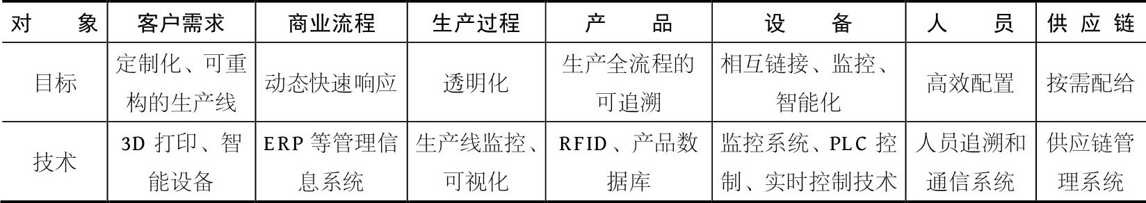 第四次工业革命是以智能化为核心的工业价值创造革命,为了满足客户个性化的需求,必须将传统的刚性生产模式转变为柔性生产模式。因此,仅仅靠在现有的控制与信息系统基础上升级满足不了智能化的要求。德国工业4.0工作项目包括“智能工厂”“智能生产”“智能物流”“智能电网”“智能建筑”等项目。其中“智能工厂”部分根据德国自身在制造业中的优势,从产品的制造端提出了智能化转型方案。其核心是利用物联网和网络物理生产系统(Cyber-Physical Production System,CPPS),等技术,为生产过程中的每个环节建立信息化的链接,实现“人、机、物、法、环”信息的高度透明。其相应的技术如表1-1-1所示。