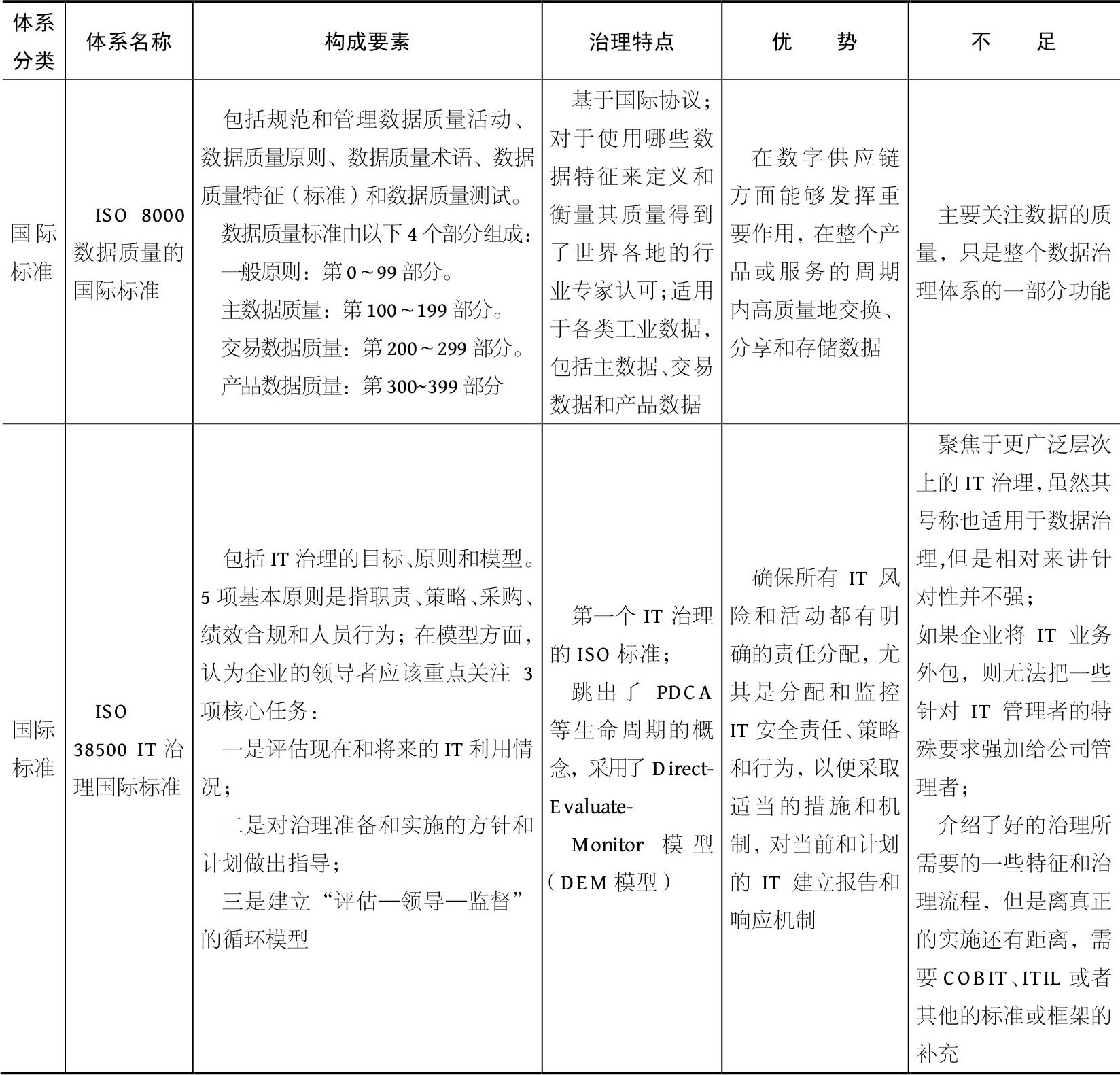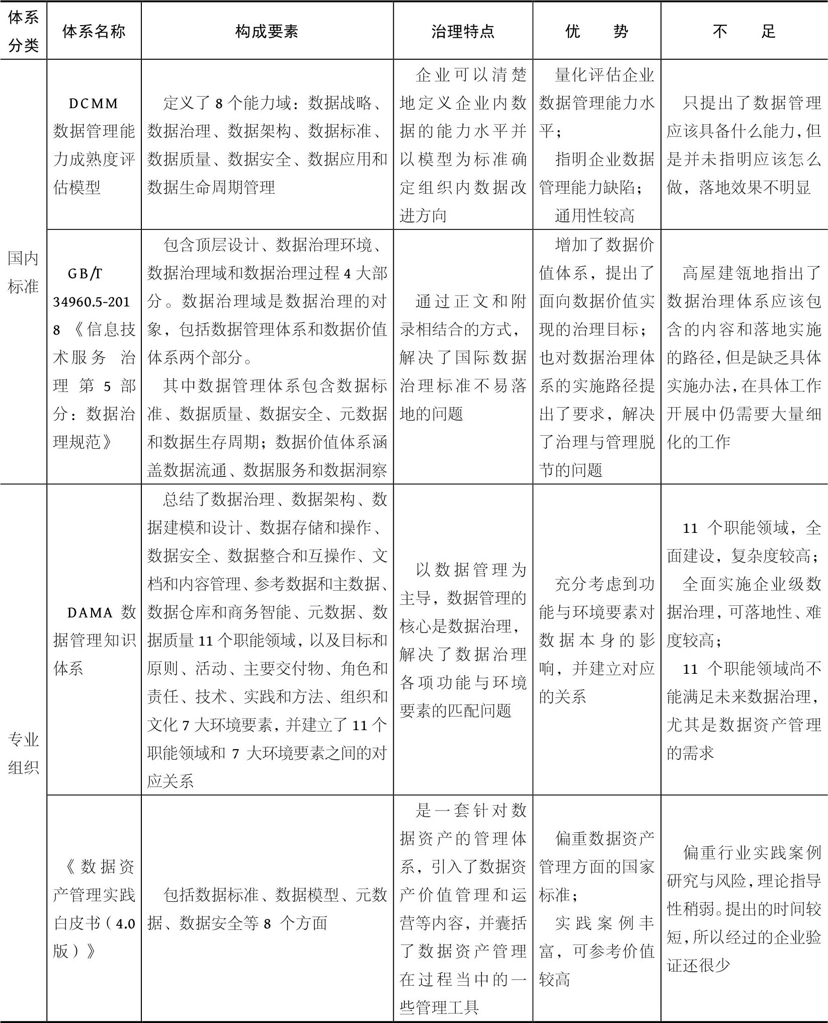 国内外各相关机构都有自己的数据治理体系,但各体系之间存在一定的差异。表3-4-1从主流数据治理体系的构成要素、治理特点、优势和不足4个方面进行了分析。
