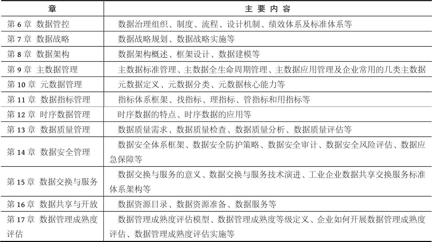 体系篇共分12章,包括数据管控、数据战略、数据架构、主数据管理、元数据管理、数据指标管理、时序数据管理、数据质量管理、数据安全管理、数据交换与服务、数据共享与开放、数据管理能力成熟度评估,如表5-1-1所示。
