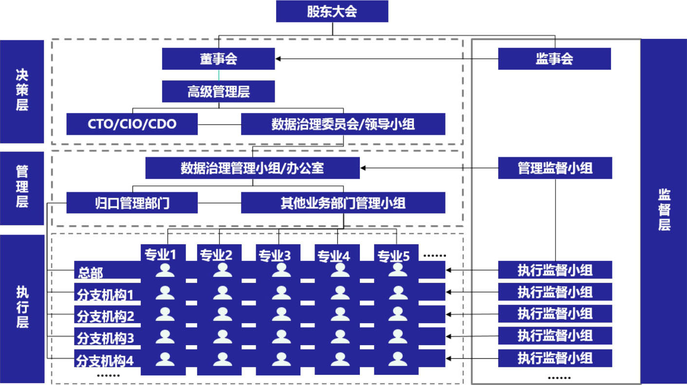 数据治理是一项需要企业通力协作的工作,而有效的组织架构是企业数据治理能够成功的有力保障。为达到数据战略目标,企业有必要建立体系化的组织架构,明确职责分工。