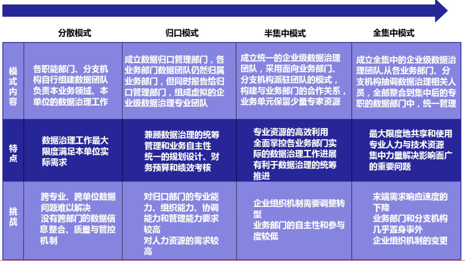 全集中模式是指在企业内构建完全集中化运作的数据治理团队,除技术部门的数据治理人员外,将各业务部门、各分支机构相关的业务专家和数据治理团队、人员全部整合到集中后的专职的数据治理团队中,并由该团队全面负责整个企业的数据治理工作。