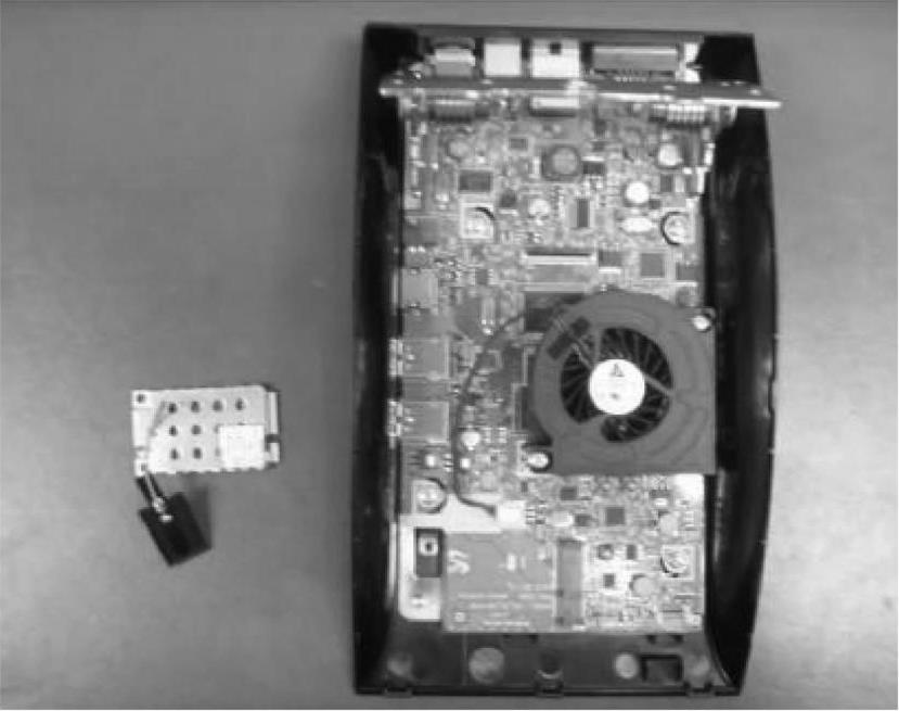 21.拆下3针连接器,并松开2颗螺钉,然后从主印制电路板上将风扇拆下,如图3-22所示。