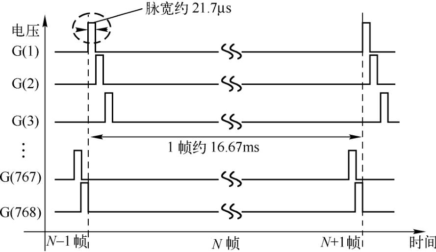 依次将整个画面的视频信号写入,再自第一条重新写入,此重复的频率称为帧频(刷新率),一般为60~70Hz。为便于理解,图1-26给出了1帧栅极扫描信号的波形图。