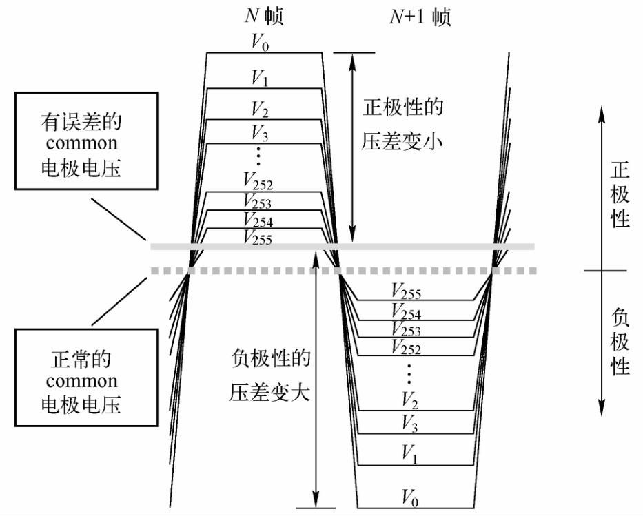 所谓Flicker现象,就是画面会有闪烁的感觉,但并不是特意做出的视觉效果,而是因为显示的画面灰阶在每次更新画面时会有些微小的变动,让人眼感受到画面在闪烁。使用逐帧倒相的极性变换方式最容易发生这种情况。因为逐帧倒相的整个画面都是同一极性,当这次画面是正极性时,下次就都变成了负极性,假若common电压有一点误差,这时正、负极性的同一灰阶电压便会有差别,当然灰阶的感觉也就不一样,如图1-24所示。在不停切换画面的情况下,由于正、负极性画面交替出现,就会出现Flicker现象。而其他面板的极性变换方式,虽然也会有此Flicker的现象,但由于不像逐帧倒相是同时整个画面一起变换极性,只有一行或一列,甚至是一个点变化极性而已,以人眼的感觉来说,就会觉得不明显。