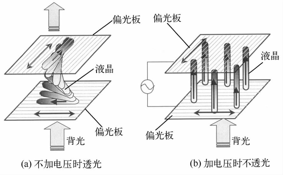 在不加电压的情况下,入射光经过偏光板后通过液晶层,偏光被分子扭转排列的液晶层旋转90°。在离开液晶层时,偏光方向恰与另一偏光板的方向一致,所以光线能顺利通过,在这种情况下,液晶层相当于是透明的,可以看到反射基板的透明电极,如图1-3(a)所示。当加一个电压时,液晶分子便会重新垂直排列,使光线能直射出去,而不发生任何扭转,使液晶不能透光,如图1-3(b)所示。在这种情况下,由于没有光反射回来,也就看不到反射基板的电极,于是在电极部位出现黑色。