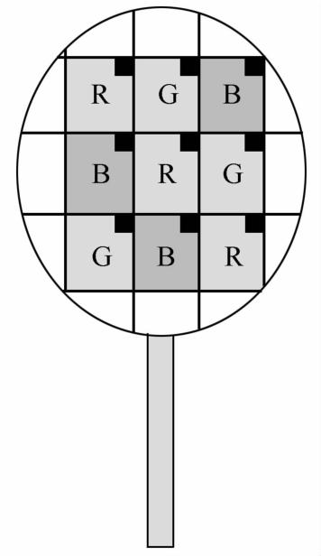 在前玻璃衬底上,也同样划分为许多小格子,每个格子均与下玻璃衬底的一个像素电极对应,但其差别是,它没有独立的电极,而只是覆盖着一小片R(红)、G(蓝)、B(绿)三基色的透明薄膜滤光片,称为彩色滤光片(或称RGB滤色膜),用以还原出正常的色彩。如果用放大镜观察液晶显示屏,可观察到图1-16所显示的样子(图中的R、G、B是笔者为了说明彩色的颜色而加的标注)。