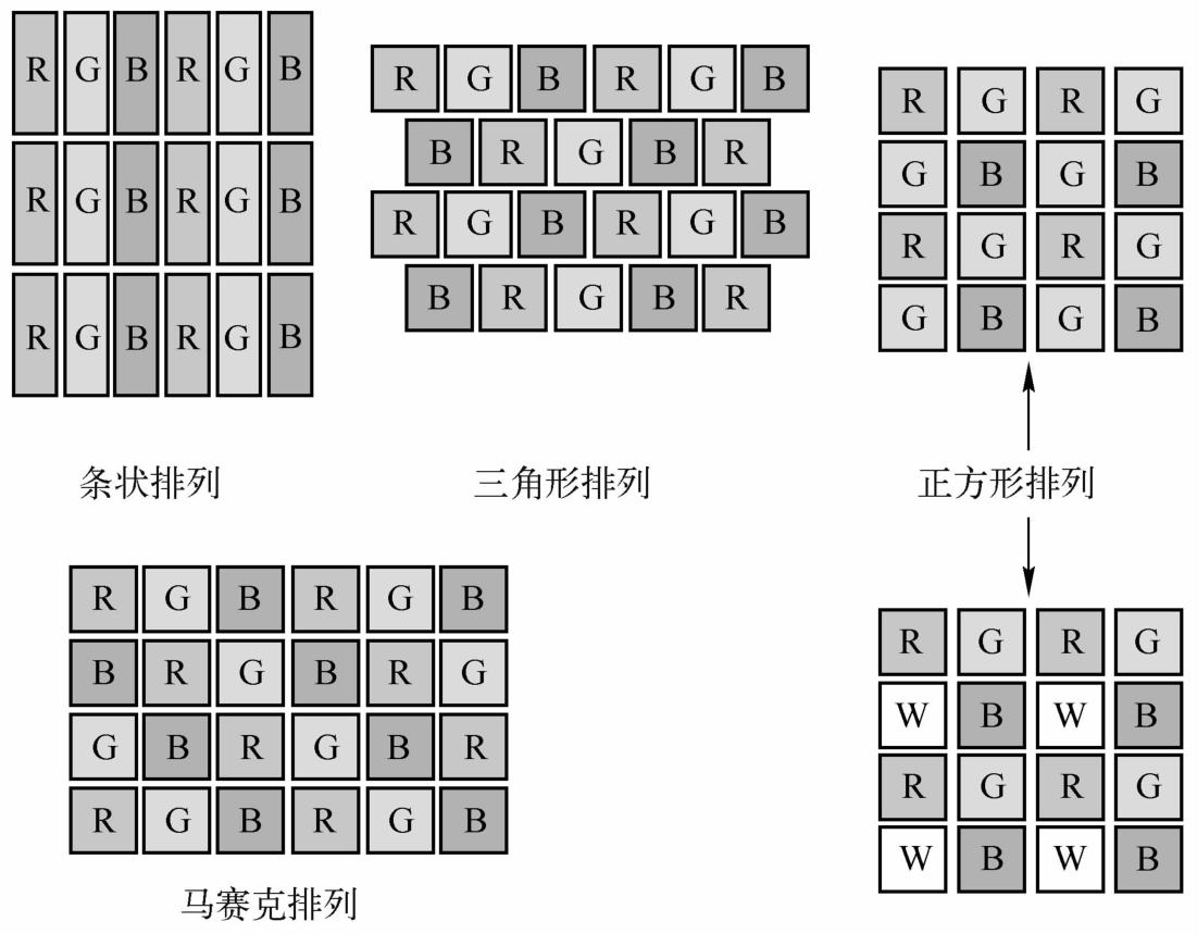 图1-17所示是常见的彩色滤光片的排列方式——条状排列,常用于办公用品,如常见的笔记本电脑或台式计算机显示器等。为什么这种应用要用条状排列的方式呢?原因是目前的软件多半都是窗口化的接口,也就是说,屏幕内容是由一大堆大小不等的方框所组成的,条状排列恰好可以使这些方框边缘看起来更笔直,而不会有毛边或是锯齿状的感觉。但是,如果应用在AV产品(如液晶电视)上,就不一样了,因为电视信号多半是人物,人物的轮廓线条大部分是不规则的曲线,因此最初使用于AV产品的都是马赛克排列(或称为对角形排列)。不过最近的AV产品中,多已改进为使用三角形排列。除了上述的排列方式外,还有一种排列,叫做正方形排列,它与前面几种不同的地方在于,它并不是以三个单元而是以四个单元作为一个像素点,而四个单元组合起来刚好形成一个正方形。