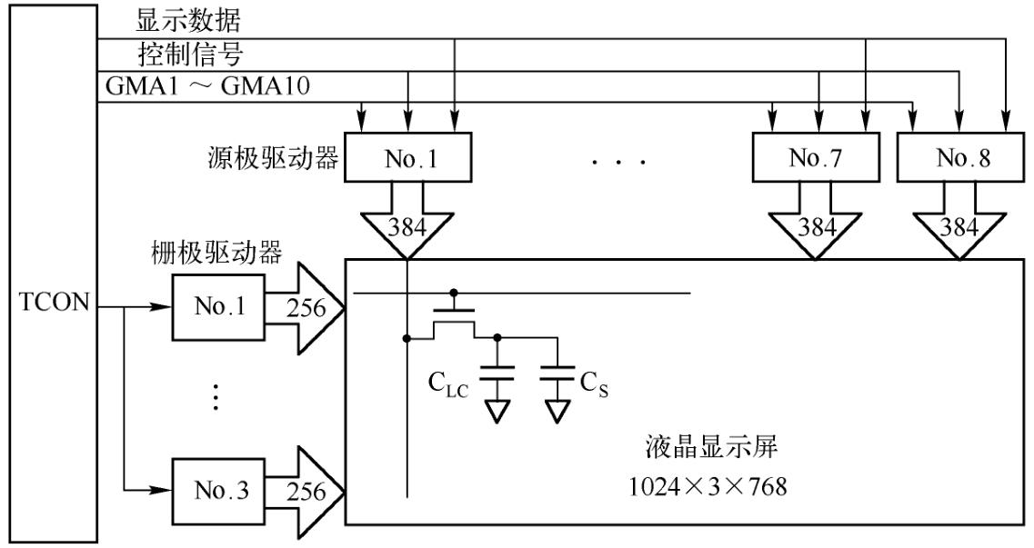 如果把一个液晶显示屏平面分成X、Y轴,分辨率为1024×768的显示屏,在X轴(水平方向)上会有1024×3= 3072列,由8个384路输出的源极驱动器(如EK7402)来驱动;而在Y轴上,会有768行,由3个256路输出栅极驱动器(如EK7309)来驱动。