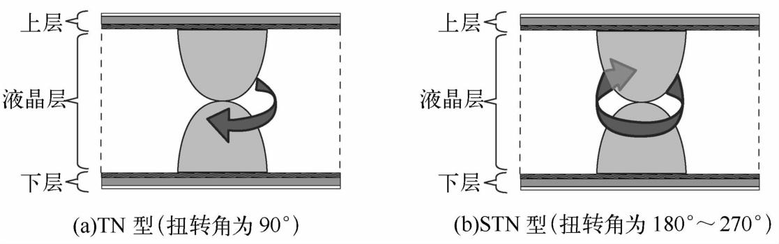 STN液晶显示屏的工作原理与TN液晶显示屏相同,只是STN的扭转角为180°~270°,而不是90°。图1-8所示为TN和STN液晶分子扭转角度示意图。