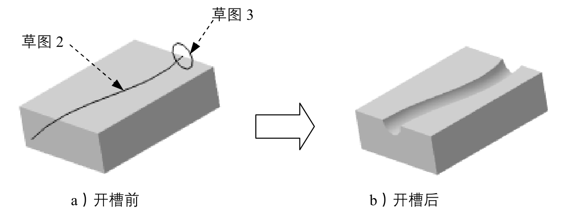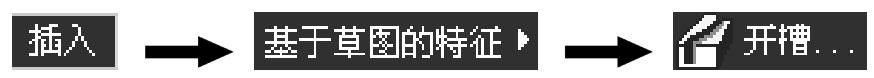 开槽特征实际上与肋特征的性质相同,也是将一个轮廓沿着给定的中心曲线“扫掠”而成。二者的区别在于肋特征的功能是生成实体(加材料特征),而开槽特征则是用于切除实体(去材料特征)。