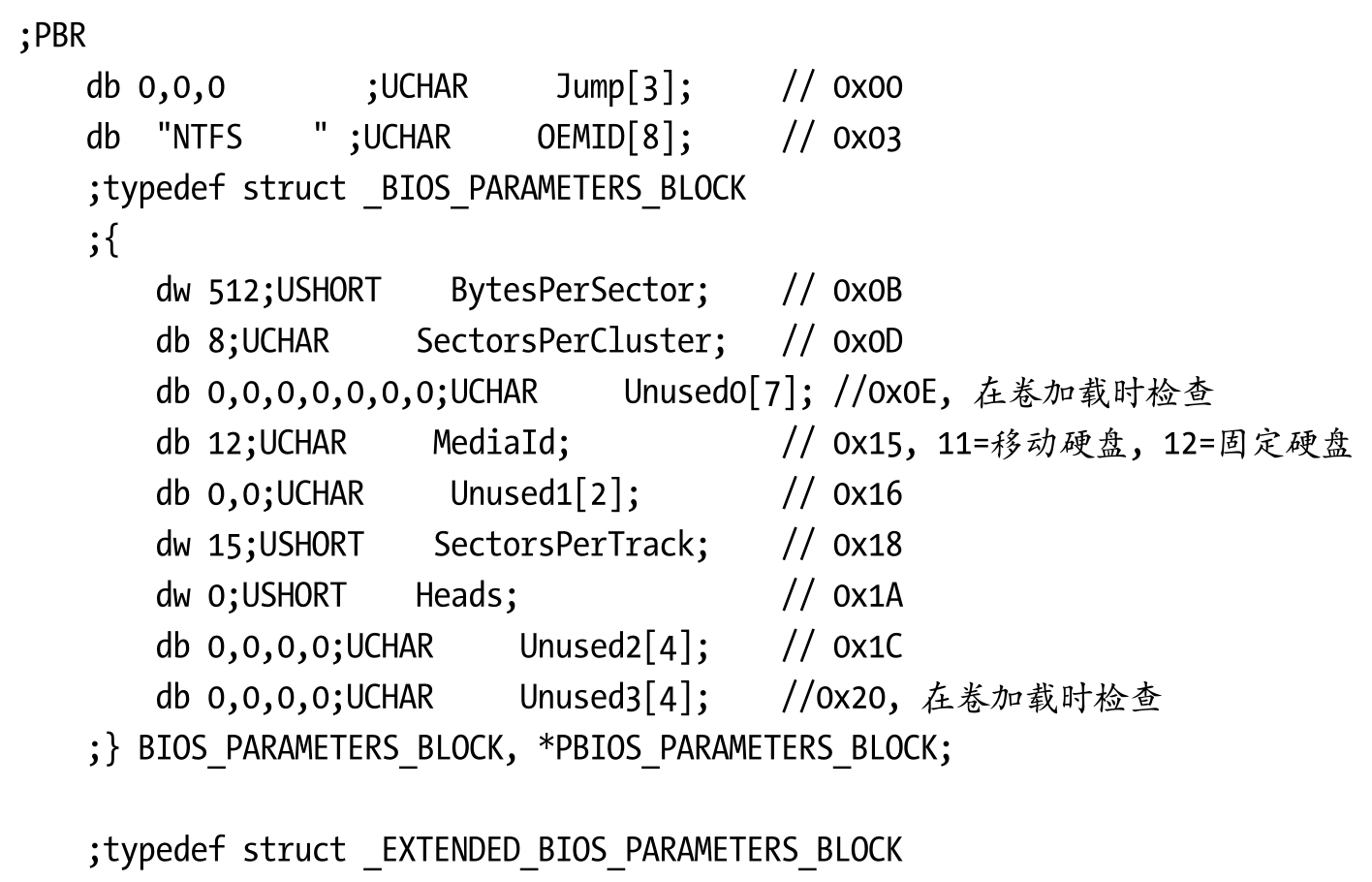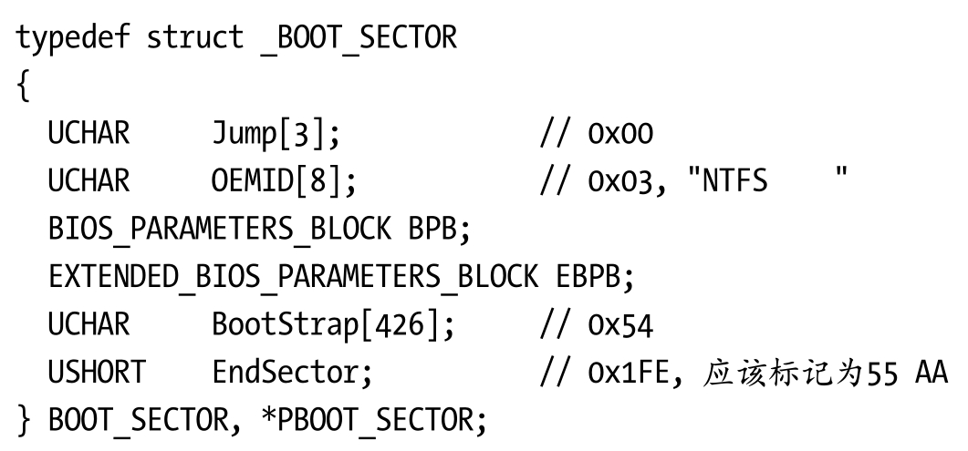 磁盘的第1扇区是MBR,第2扇区是系统的第1个分区(Partition1),也就是我们说的C盘,这是我们的文件系统驱动程序需要检测并加载文件系统来解析的扇区。操作系统把整个磁盘当作第0分区(Partition0)。下面是属于Partition1分区的第1扇区结构。
