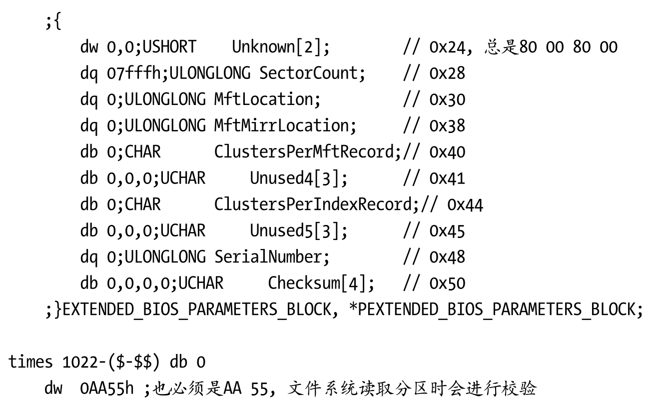 因为我们不需要使用启动分区的代码,所以可将其初始化为0,但是BPB和EBPB结构是需要填写的,以便文件系统挂载分区时进行识别。启动扇区应该结合文件系统来设计,比如我们可以省略最后应该标记的55 AA,就是因为后面编写的LDFS文件系统不需要检查。但是在内核下的NTFS文件系统和Disk磁盘类驱动需要检查启动分区标志,又不能省略。