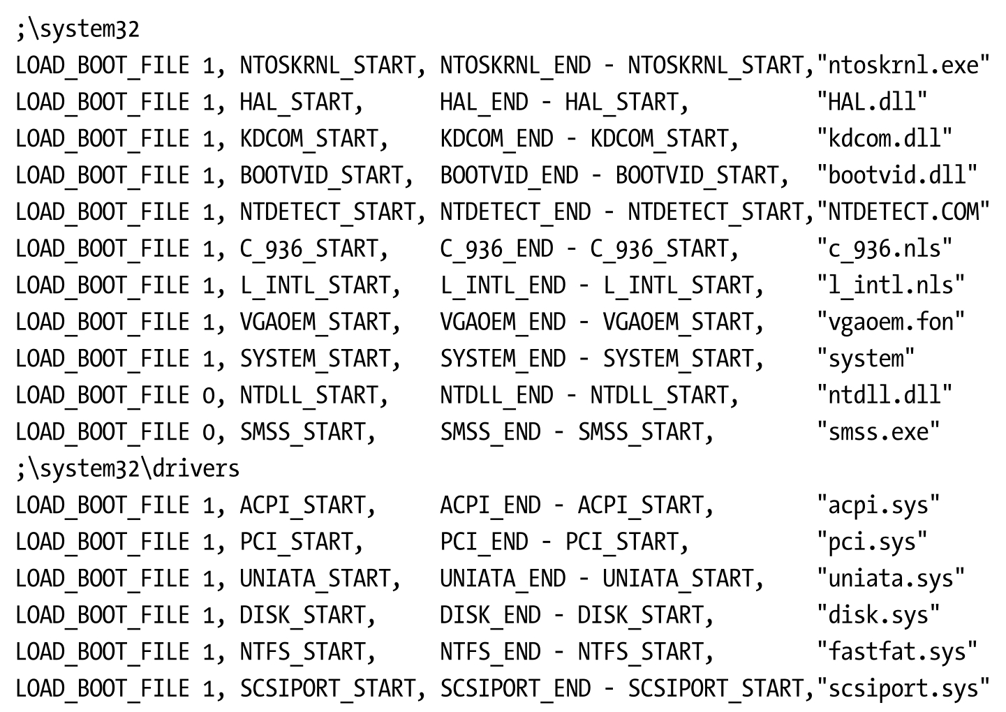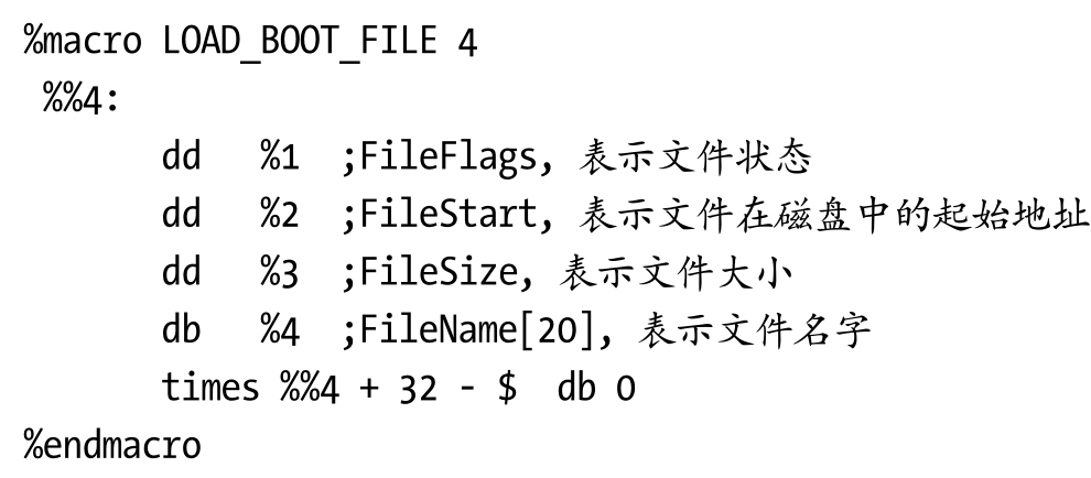 通过LOAD_BOOT_FILE宏,NASM自动帮我们连接并定位到磁盘特定的位置上。我们通过这样的方式把文件安装到磁盘里,这些文件属于LDFS文件系统格式,只能由LDFS解析。上面是我们学习ReactOS使用的文件。如果是学习WRK,加载的文件又是不同的,这部分没有列出,可以参看boot.asm源码部分,注意有些数据可能被注释了,去掉注释即可。要么设置使用ReactOS文件,要么设置使用WRK文件。每次切换时,都需要重新编译。