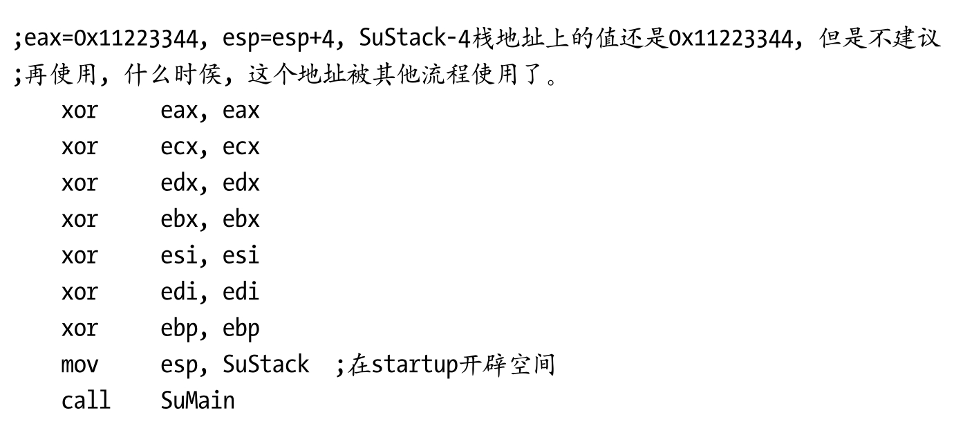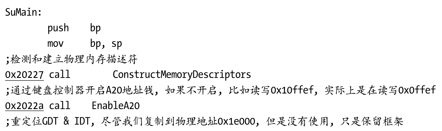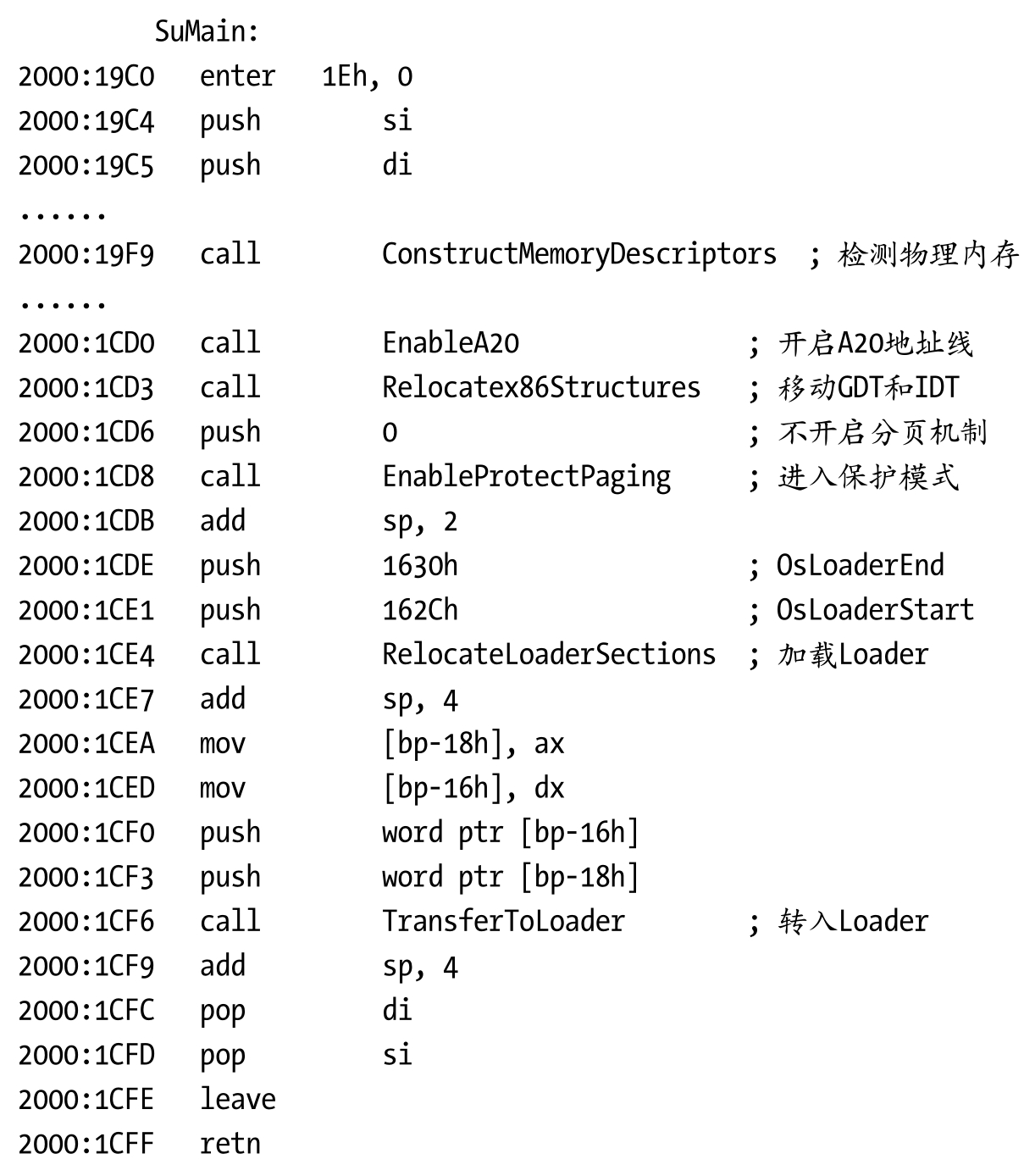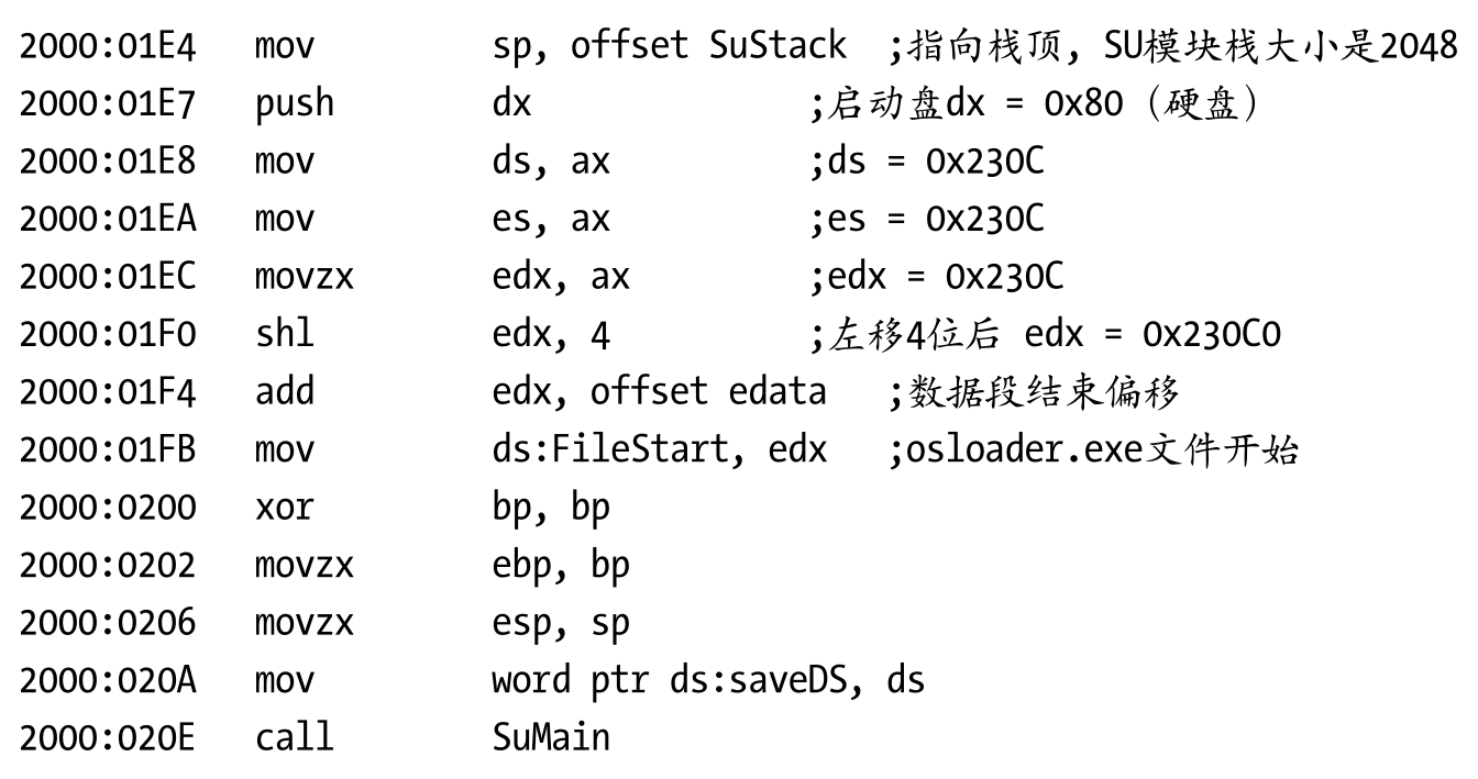 首先设置寄存器的使用环境。_GDT是数据段开始的偏移,_edata是数据段结束的偏移,上面标注的一些具体数值是从调试过程中得出的。前面说过,NTLDR是由startup.com和osloader.exe合成的,在这里我们可以看到startup.com结束之后紧跟着的就是osloader.exe文件的开始。这种处理使得两个不同的文件合成为一个文件,在SU模块运行时又能找到osloader.exe文件的开头。RealStart完成寄存器上下文的初始化设置之后,SuMain正式进入为后续加载osloader.exe提供支持的初始化工作。