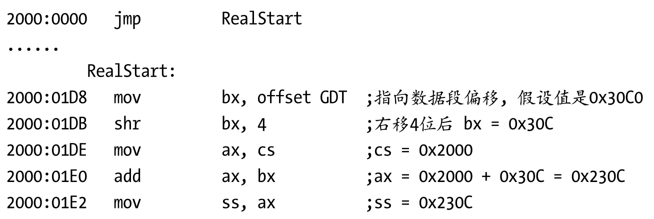尽管我们构建的代码和原版有些出入,但是也不会产生什么错误,反而更能清晰地了解执行流程,而且在我们调试时,也能从源头知道每个寄存器的值。对于startup.com调试,如果MBR部分已经学会了,可以直接跳过。下断点b 0x20000,再输入c,就来到了SU开头的指令jmp RealStart,如图2.3所示。