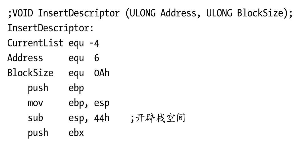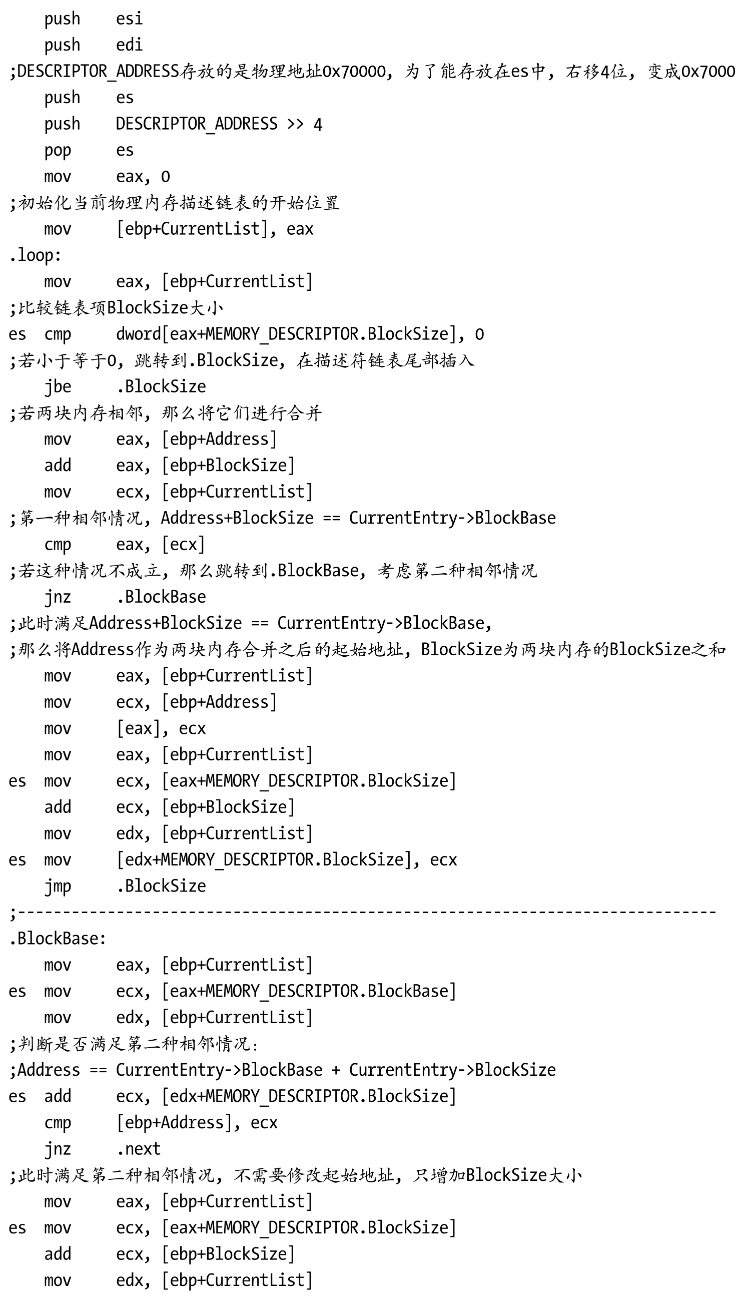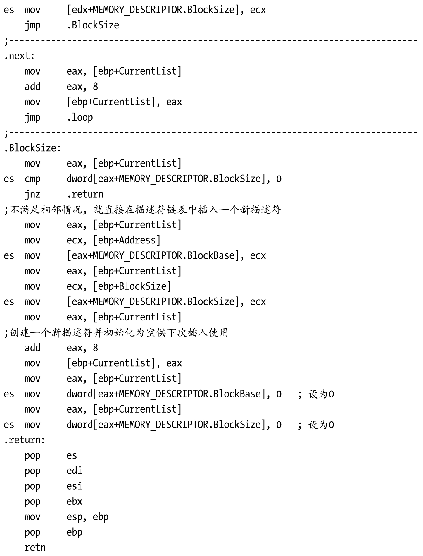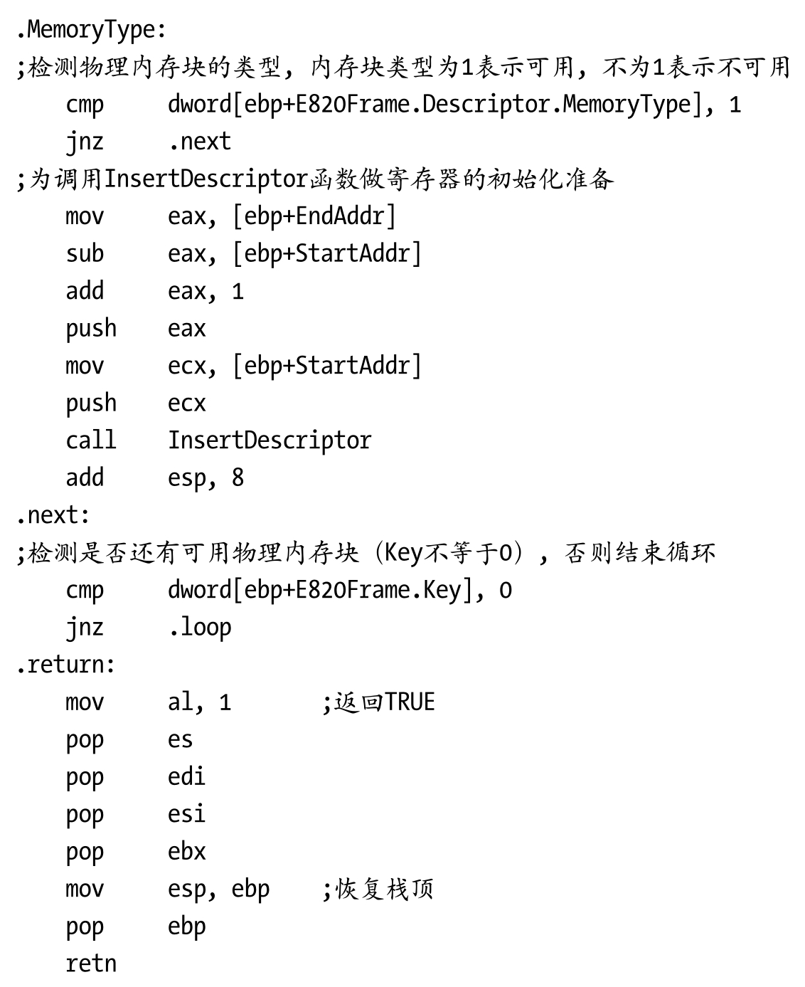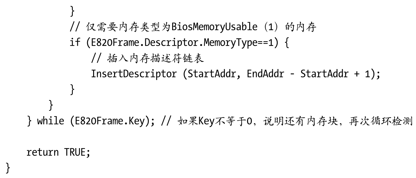 Key值为0时,表示已无物理内存块存在,可以停止检测。调用Int15E820函数返回一块物理内存的具体信息,若该物理内存信息无错误,计算该块物理地址的起始地址和结束地址,因为这里最多只支持4GB内存,所以内存地址的高字节只能为0。若参数值MemoryType为BiosMemoryUsable(1),表示该物理内存可用,那么调用InsertDescriptor函数就可以将该物理内存块插入到物理内存描述链表中。