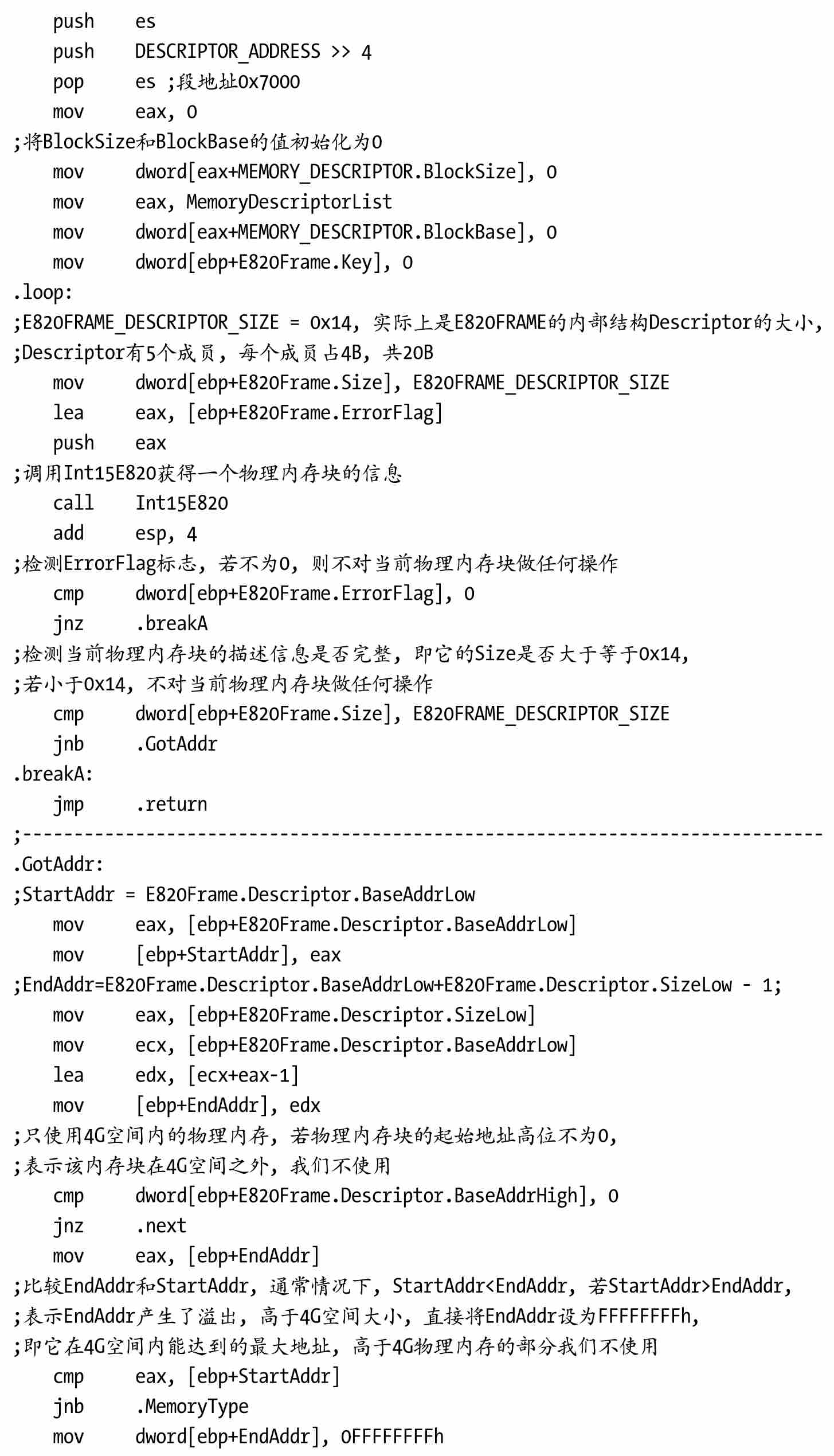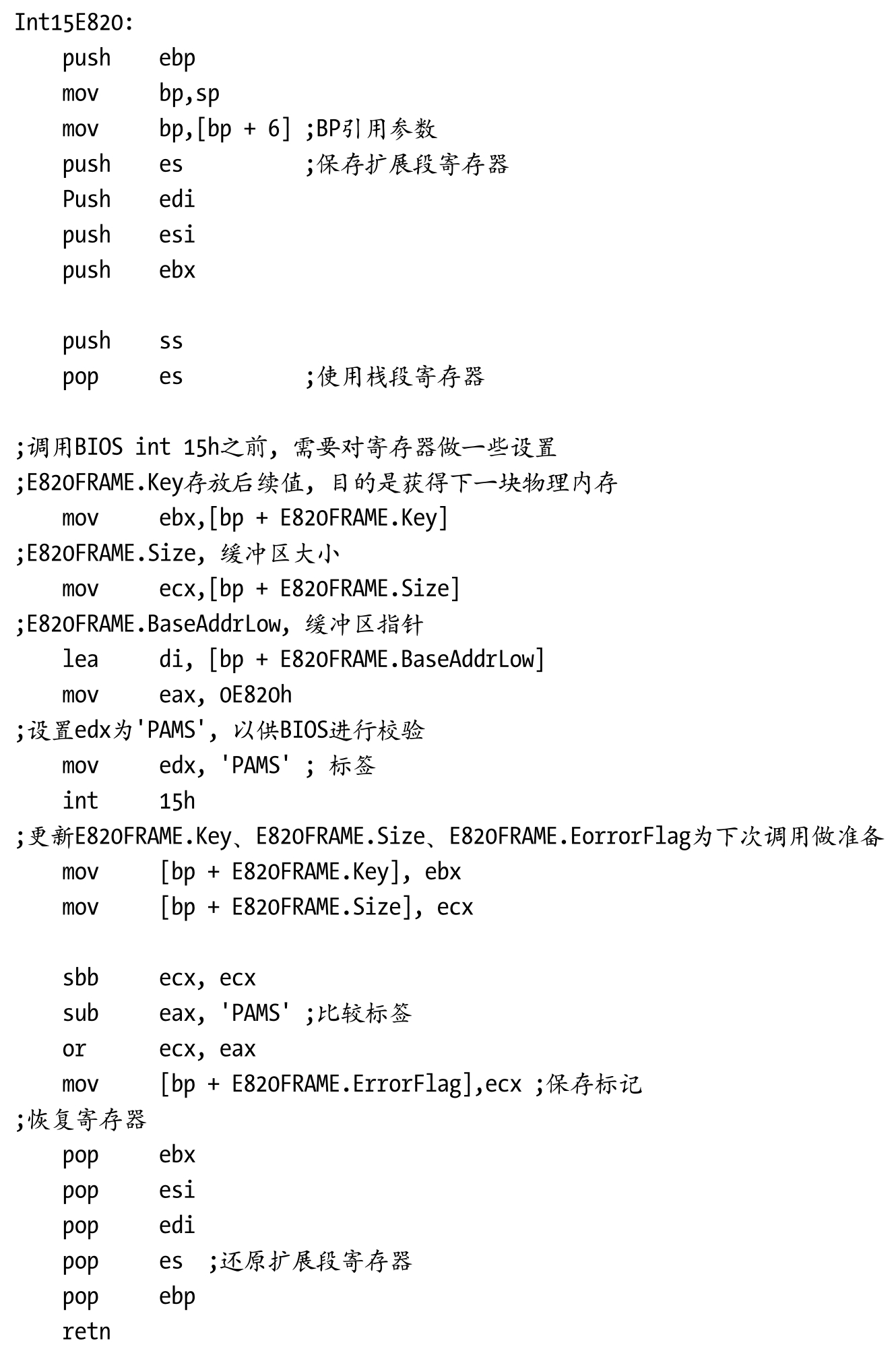 接下来进入循环检测物理内存阶段。调用Int15E820函数进行物理内存块的枚举(其内部使用BIOS中断INT 15H/E820)。循环条件是E820Frame.Key,当该值不为0时,表示还有物理内存块存在,需要继续进行检测,这个Key值是调用INT 15H后由ebx寄存器返回的结果值(读者可以参考关于BIOS中断15H的详细用法)。