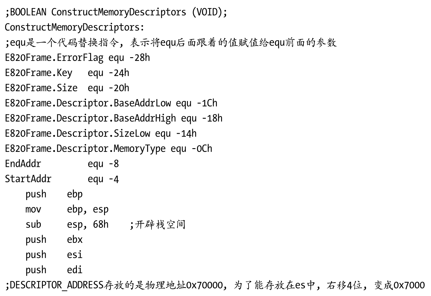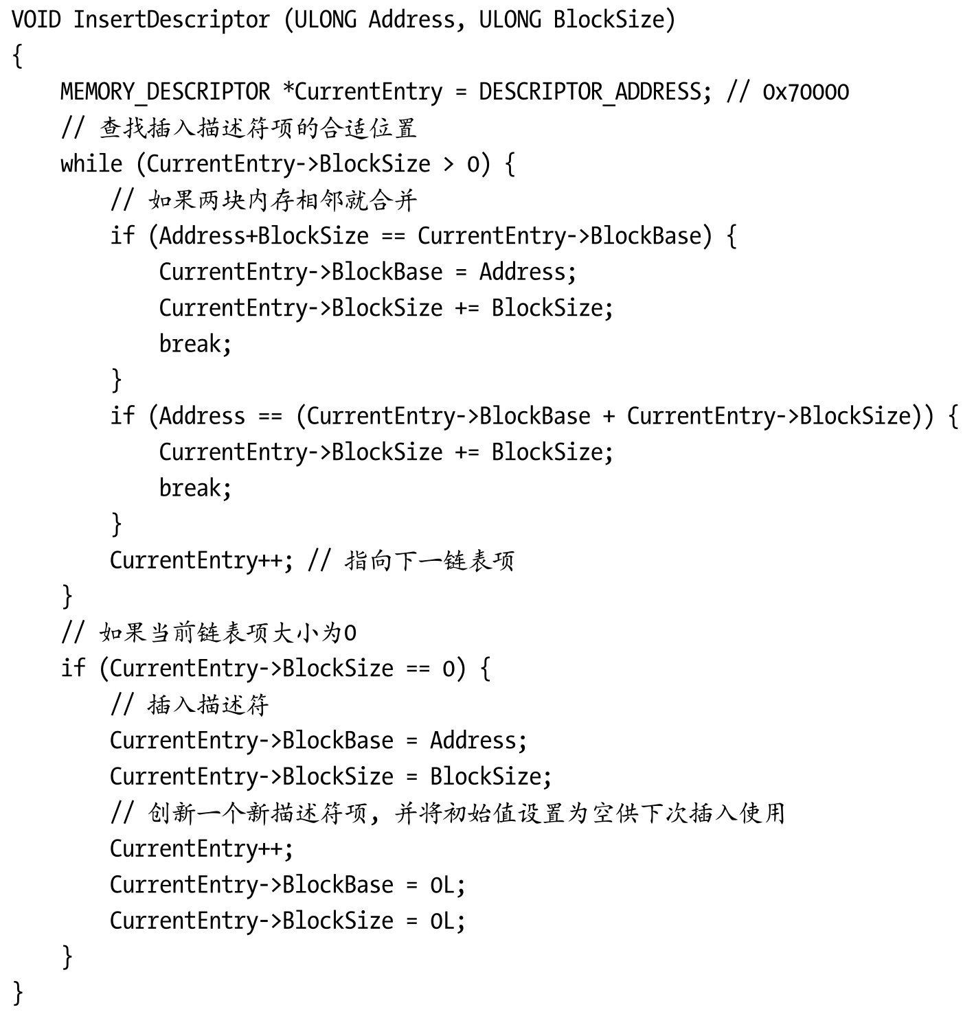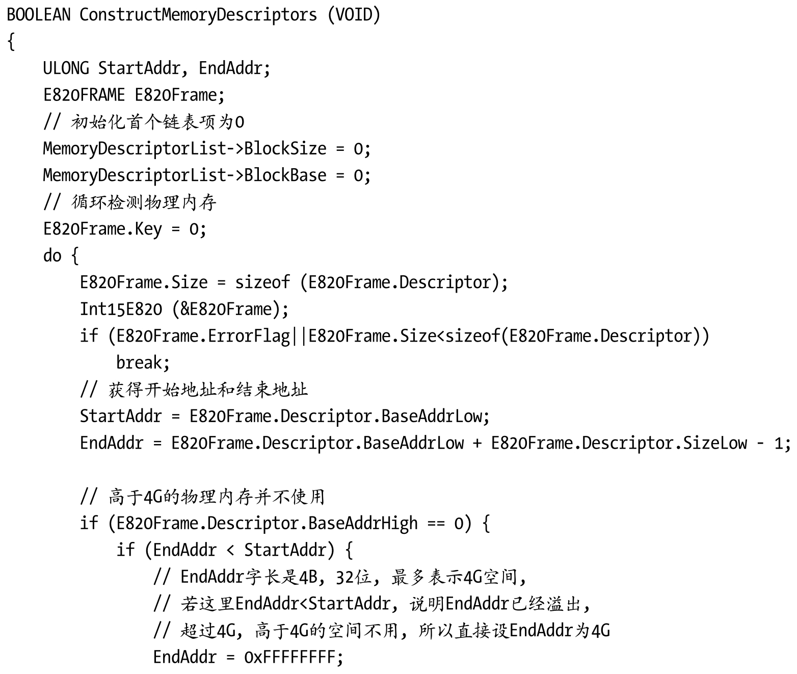 下面给出ConstructMemoryDescriptors函数的C语言代码,让大家能从整体上把握物理内存检测的主要步骤。