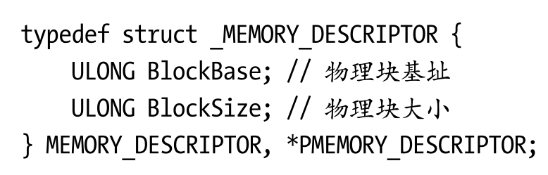 计算机中的物理内存分成若干区域,有些区域是可用的,还有少量区域则被保留。SU将调用ConstructMemoryDescriptors函数来检测可用的内存区域,生成一个内存描述符链表结构,由MemoryDescriptorList链表指针所指。这条内存描述链将被后面的Loader使用。内存描述链的每个表项都是MEMORY_DESCRIPTOR结构,用来描述一块内存区域的基址及长度。内存描述符结构如下: