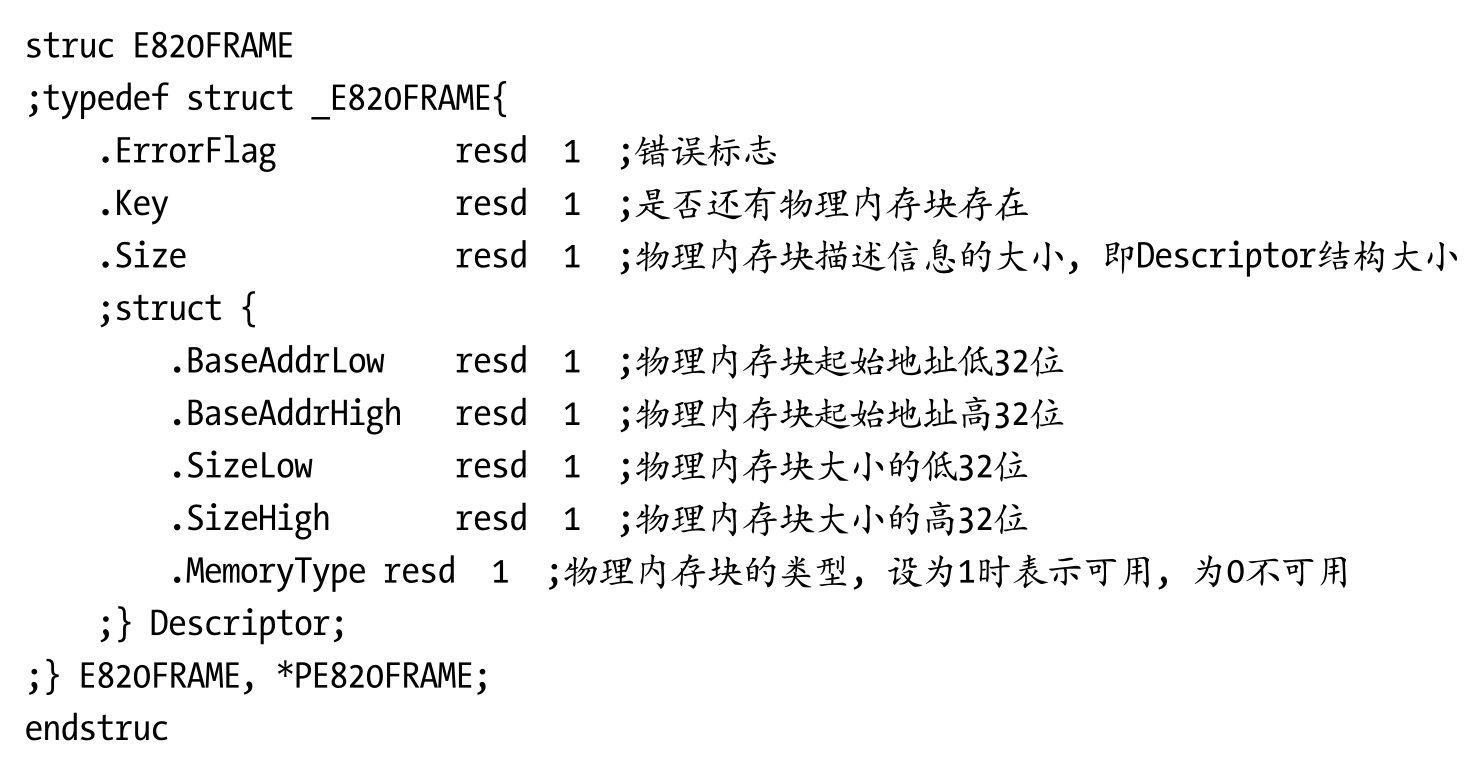 这个结构提供两个字段,BlockBase指明物理内存的起始地址,BlockSize指明物理内存块的大小。这里还有另一个提供给BIOS中断15H/E820使用的结构,用来检测和返回物理内存块的信息,它描述一块物理内存的具体信息: