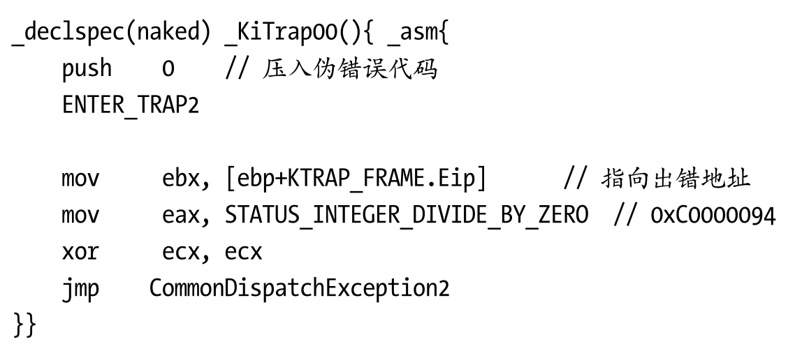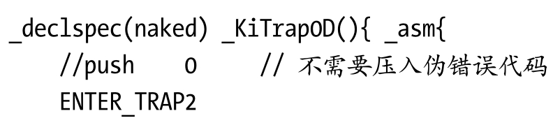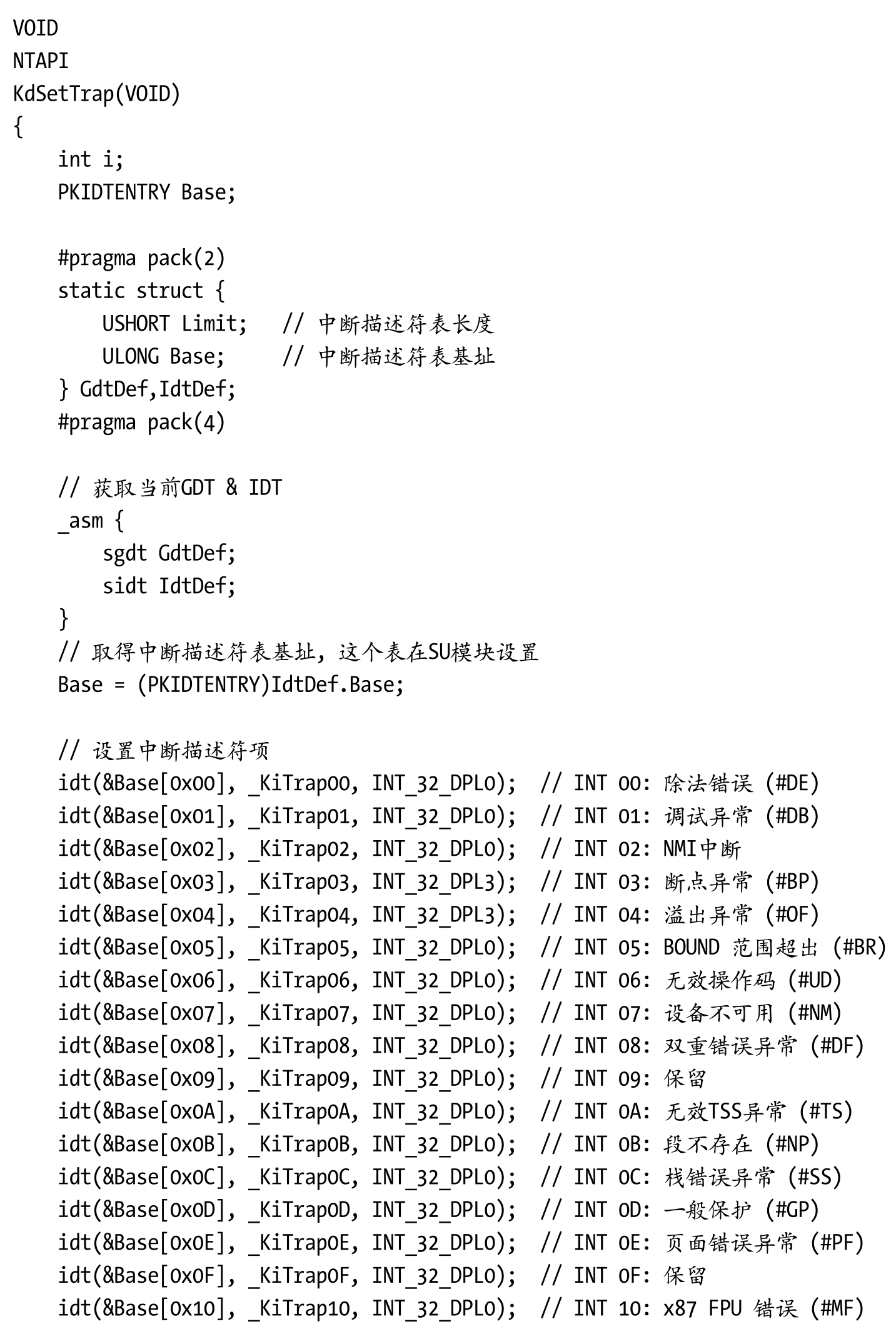 知道了原理,我们的首要任务是在中断向量表中注册异常处理例程(或叫中断处理例程),对照图3.3来设置异常处理例程:除零错误_KiTrap00(#DE),单步断点_KiTrap01(#DB),INT3断点_KiTrap03(#BP),一般保护性错误_KiTrap0D(#GP),页面错误_KiTrap0E(#PF)和调试器调用_KiTrap2D(debugger call)。这些例程框架大多数是用内联汇编编写的,其实C语言也可以编写例程框架,只是在精确控制寄存器方面没有优势。