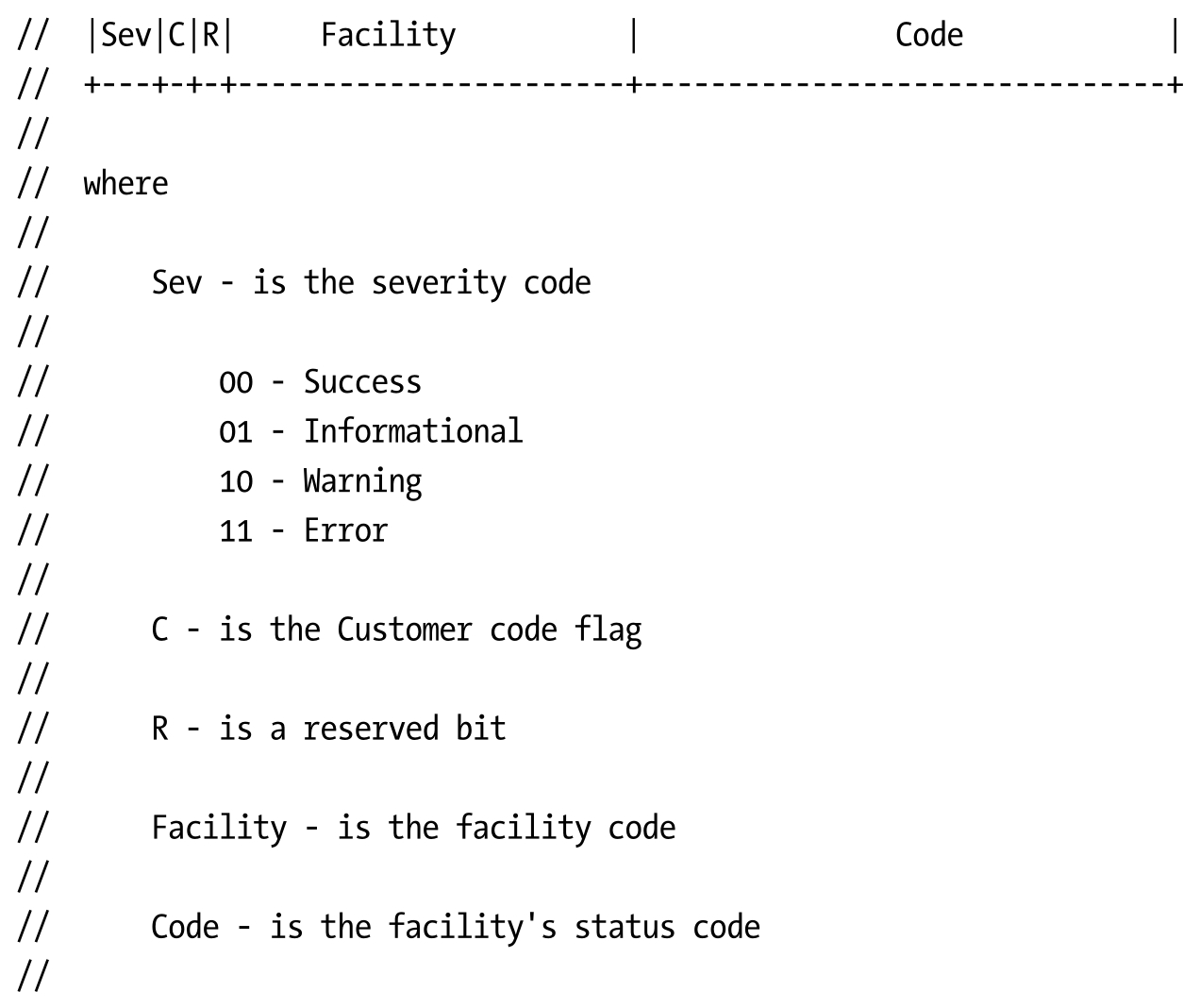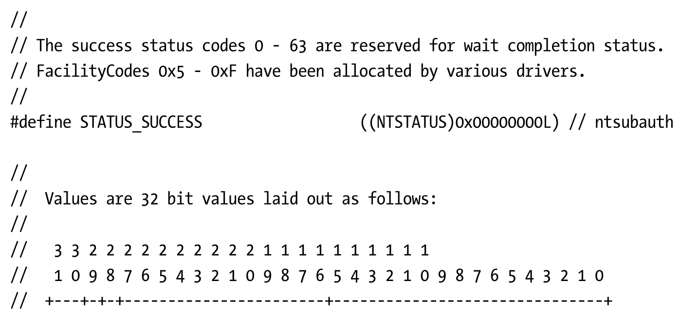 最高2位表示安全级别码:00为成功,01为信息,10为警告,11为错误。以0xC开头的表明出错特别严重,其次是以0x8开头表示的警告,最后是以0x0开头表示的成功。比如,STATUS_BREAKPOINT(0x80000003L)断点信息,STATUS_ACCESS_VIOLATION(0xC0000005)访问违规错误,STATUS_IN_PAGE_ERROR(0xC0000006)页面错误。Windows API大多数执行结果都会返回异常代码,查看高2位可以判断是哪一类型,更详细的解释可对照ntstatus.h文件或查阅MSDN,这些在编程和调试中都是必须要掌握的技能。