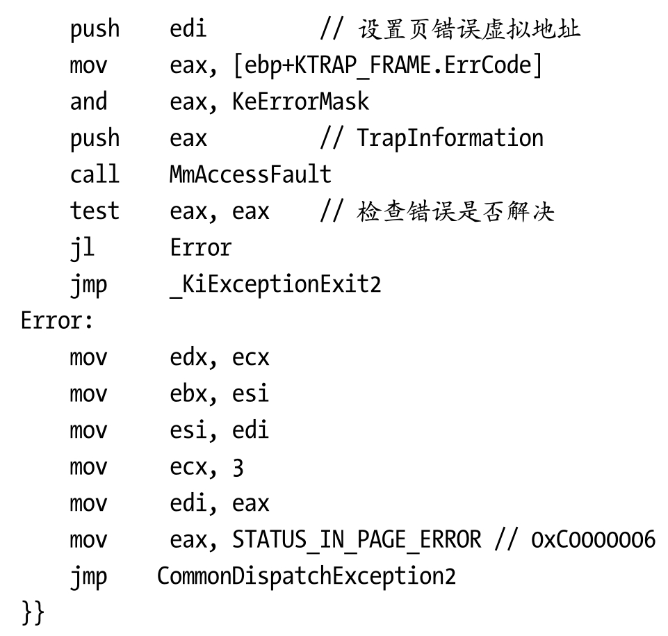 页面出错的地址保存在cr2寄存器中。调用MmAccessFault函数处理不存在的页面,如果引用的页面被加载到内存中,则成功返回继续执行。如果MmAccessFault函数处理失败,则返回错误状态码。在Loader模块中若发生#PF错误,MmAccessFault函数只是简单地返回STATUS_ACCESS_VIOLATION,随后交给调试器处理。在调试器中我们可以处理这些页面或者不处理直接返回。如果内核态有2次不处理,会使系统直接崩溃,在用户态,应用程度会终止。我们将在第6章和第7章中介绍MmAccessFault函数,这是一个比较重要的函数。