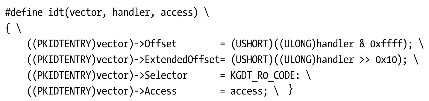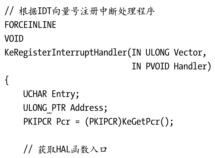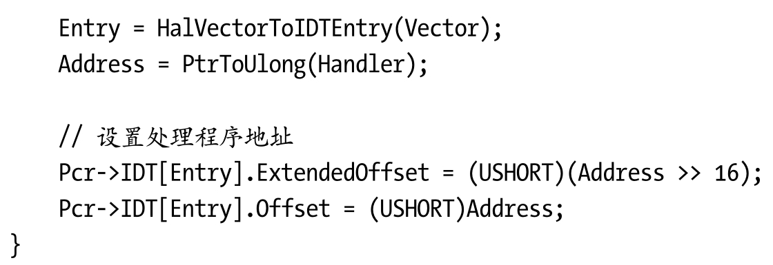 256个中断中未使用的都需要设置Selector和Access值。如果不这样做,会有未知的错误发生,比如HAL硬件抽象层设置的时钟中断,就不会设置Selector和Access值,它只会设置Offset和ExtendedOffset。我们来看一下KeRegisterInterruptHandler函数的实现: