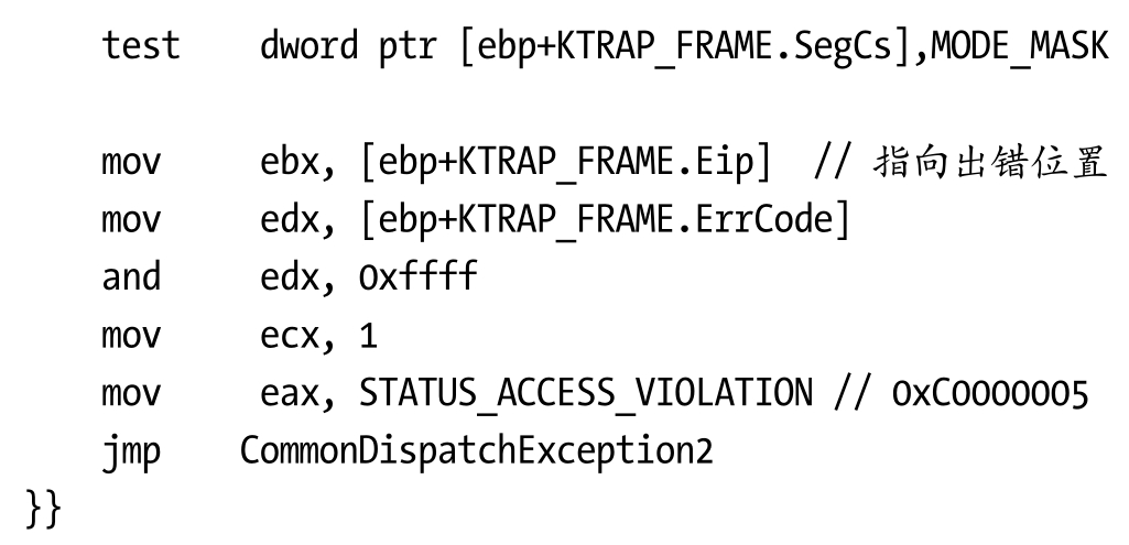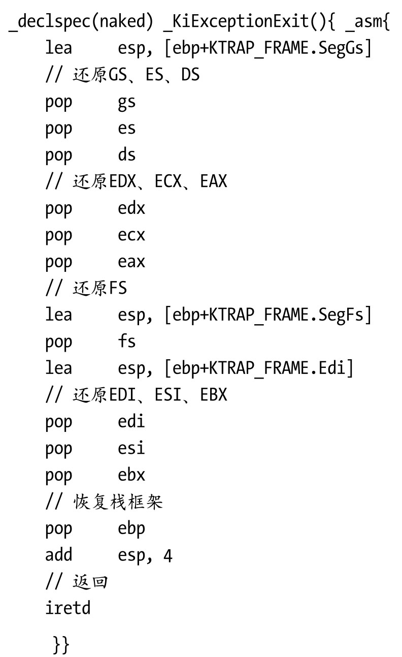 把原来保存在KTRAP_FRAME结构中的寄存器值还原给进入此例程前CPU的寄存器,iretd指令返回相应的位置,iretd指令也可以返回用户模式,进入用户代码段。iretd返回的可能是原eip的下一条指令地址或是继续原出错的地址,取决于异常是怎样被处理的。这里还提供了另一个版本的异常退出函数KiExceptionExit。