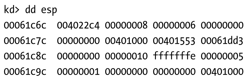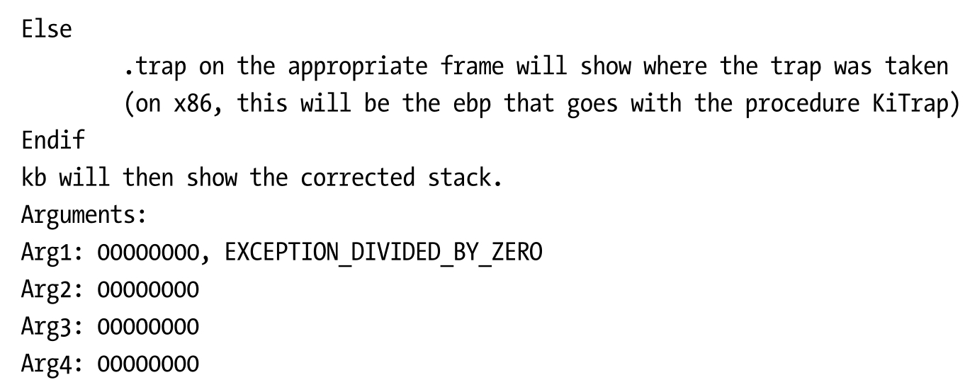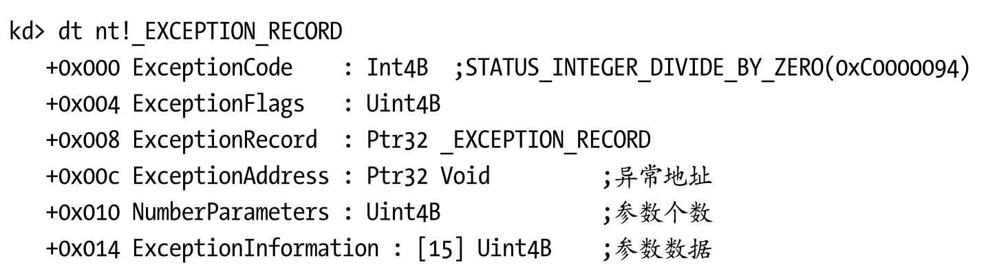 ExceptionCode(异常代码)用于指定异常的原因(如,0xC0000094是除零异常产生的)。ExceptionFlags(异常标志)描述异常的属性。ExceptionAddress指向硬件异常或软件异常发生的地址。对于所有的异常记录信息,这个值是最重要的,它能准确指出产生异常的地址来源。如果调试器加载了正确的符号文件,异常的来源很容易被标示出来,调试器中使用!analyze-v命令就会显示出错的源码位置。中断发生也可能有一些参数传入,比如_KiTrap2D通过寄存器传递参数(不是通过__fastcall调用),第1个参数值存放在eax,第2个参数值存放在ecx,第3个参数值存放在edx,第4个参数值存放在ebx,第5个参数值存放在edi。