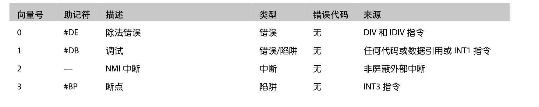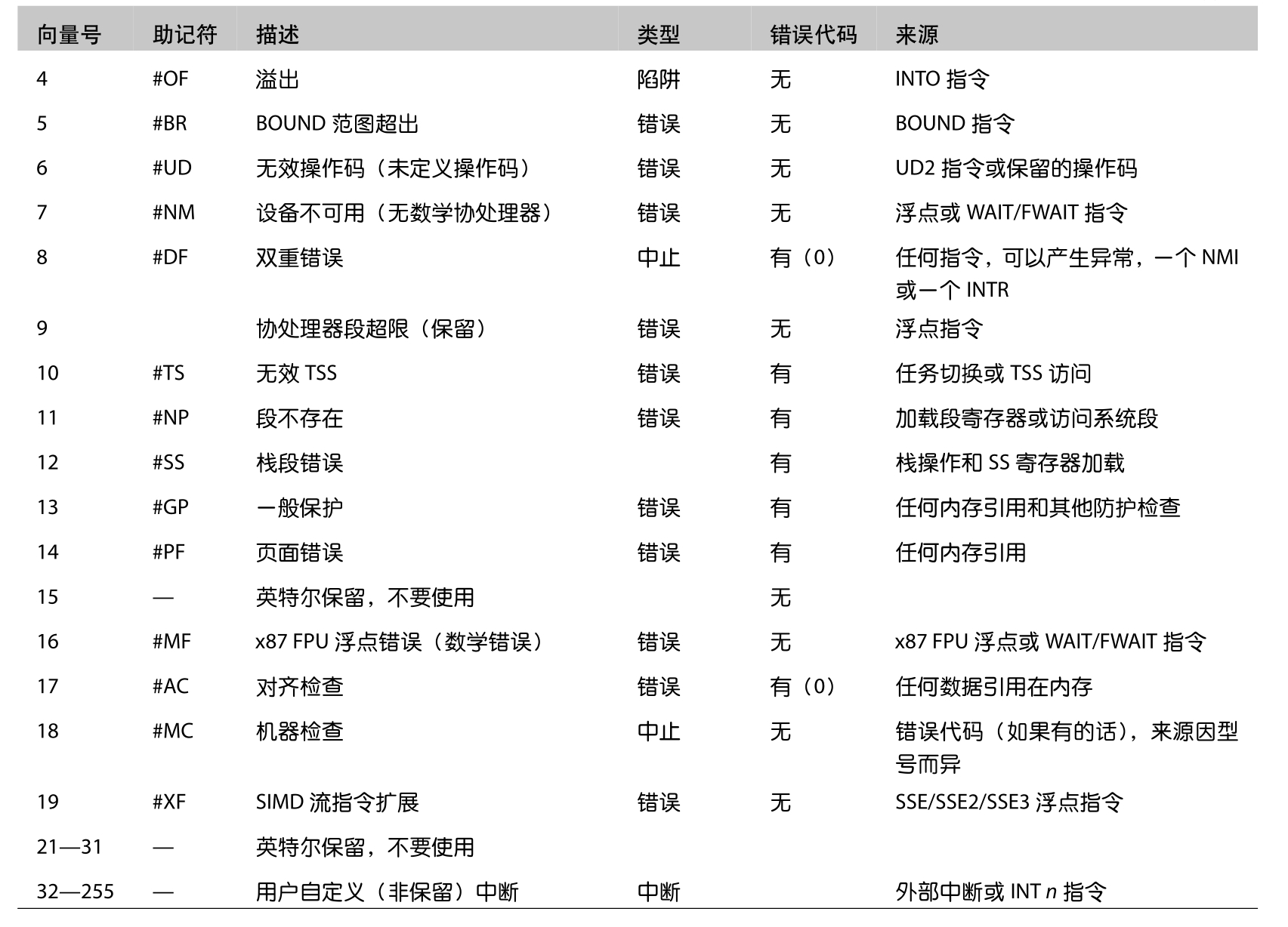 为了帮助处理异常和中断,体系结构对每个异常和中断分配了唯一的识别号,称为一个向量号(vector No.)。处理器使用向量号作为进入中断描述符表(interrupt descriptor table,IDT)的索引。中断描述符表提供了异常或中断处理程序的入口点。向量号所允许的范围是0—255。其中0—31保留给Intel 64和IA-32架构所定义的中断或异常使用,32—255留给用户定义。更多信息参见表3.1。