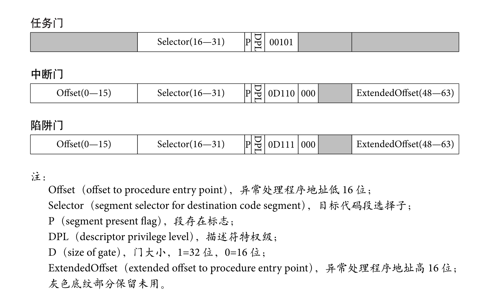 中断和异常在概念上有一些细小差别。比如,时钟相隔一定的滴答数会定时产生一个中断,我们说产生中断比较合理;而除零操作产生的错误叫作异常比较合理。异常一般会导致中断,中断并不意味着异常。异常可恢复回到原地址继续执行,如页面错误被处理后。无论产生的是中断还是异常,控制权都会转到IDT向量表相应的门描述符项处理函数中。下面讲述描述符项结构: