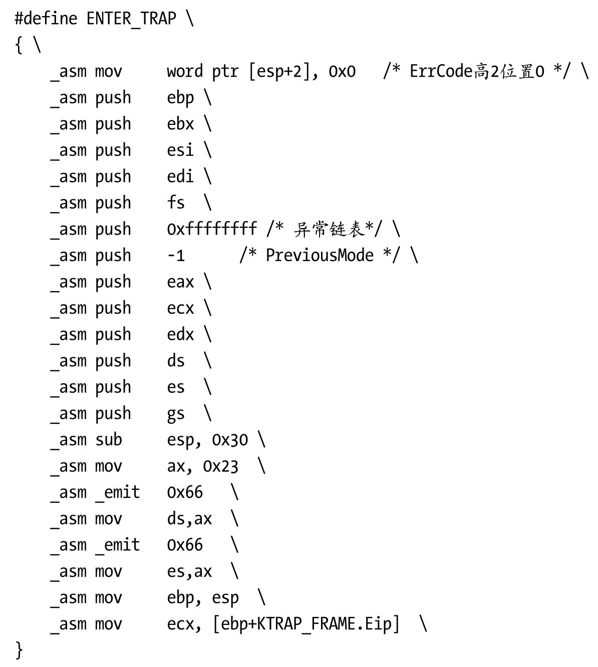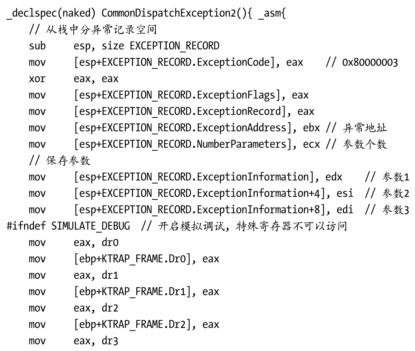 通俗一点讲,异常处理程序栈框架的主要作用就是在控制权进入时保存寄存器,退出时还原寄存器。一般函数的栈框架是依赖于编译器帮助实现的,而这里的栈框架必须自已实现,因为异常处理程序对寄存器需求远大于一般函数,而且必须保证寄存器的安全性和完整性。异常处理程序框架部分采用汇编编写有着得天独厚的优势,在WRK中我们可以看到大量的MASM汇编编码和C语言链接。笔者不太喜欢MASM汇编烦琐的形式,所以使用了精简的函数内联汇编。