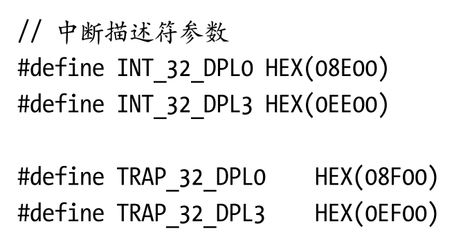 为了方便安装中断描述符,设置了idt宏,Selector选择子全部设为08,它是内核代码段选择子,从Loader模块开始我们使用的代码段选择子都是08。