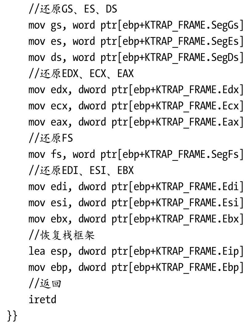 这个函数的作用和_KiExceptionExit2一样,用于还原寄存器,只不过它是通过出栈的方式直接一个一个地还原寄存器,我们说过,这种方式比较高效。