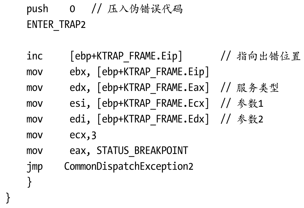 断点异常是由一个单字节0xCC(INT 3)指令造成的。在WinDbg中按F10键,内核调试组件在相应的内存位置写入一字节码0xCC,CPU执行到0xCC时便会产生中断,转而进入以下例程。